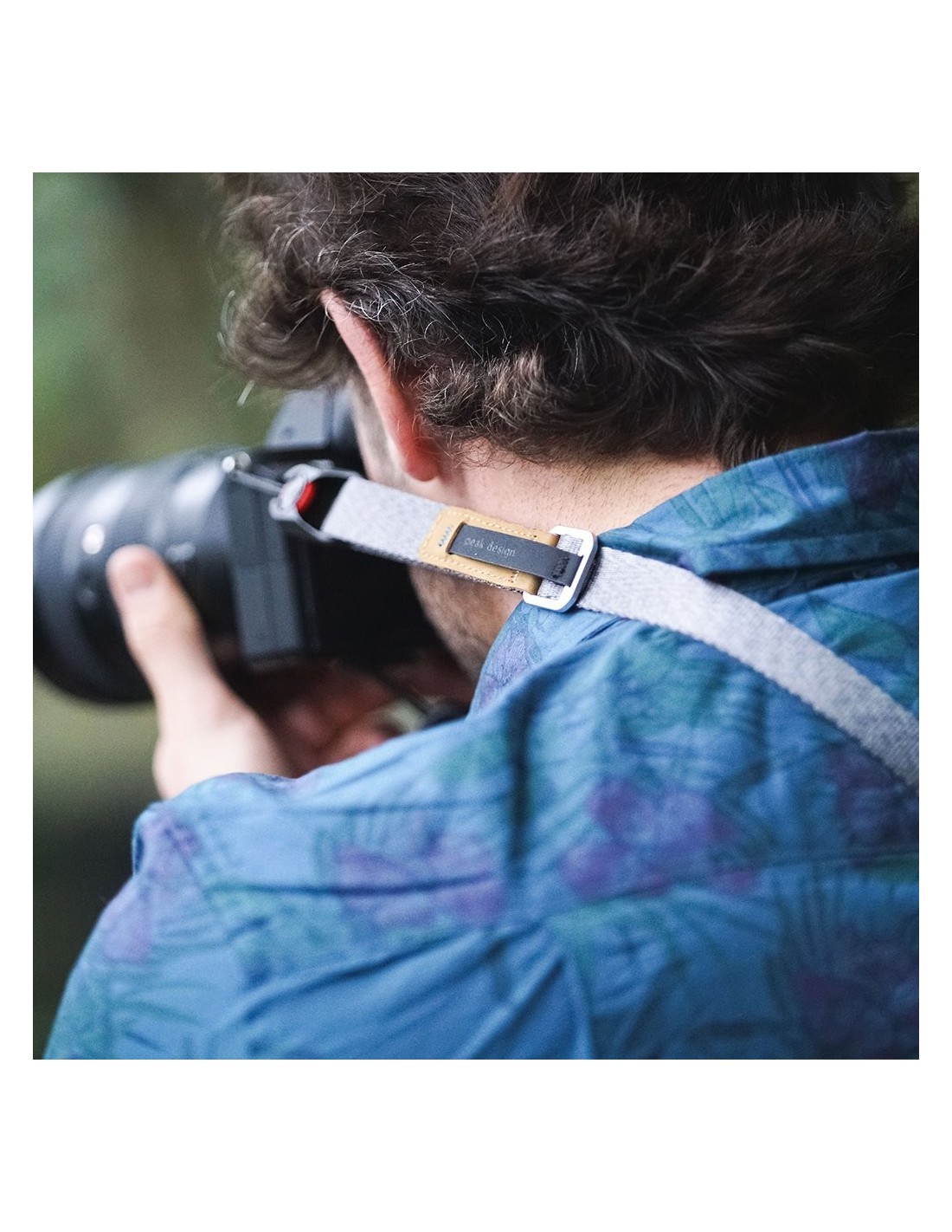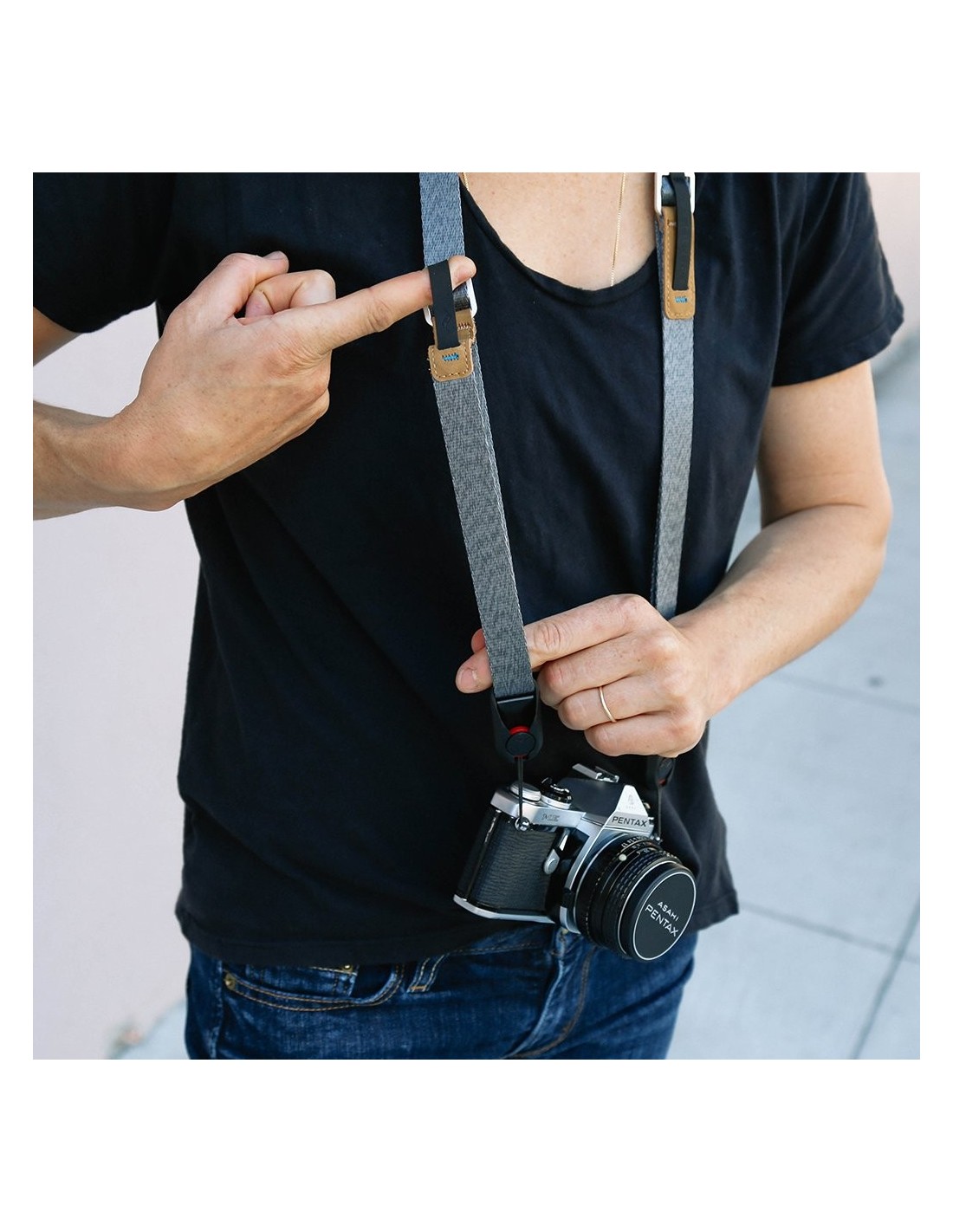 Los ajustadores rápidos exclusivos de aluminio / Hypalon permiten el ajuste con 1 dedo. Acorte la correa para un transporte estable durante la actividad física. Alargue para acceder a su cámara para realizar tomas activas.