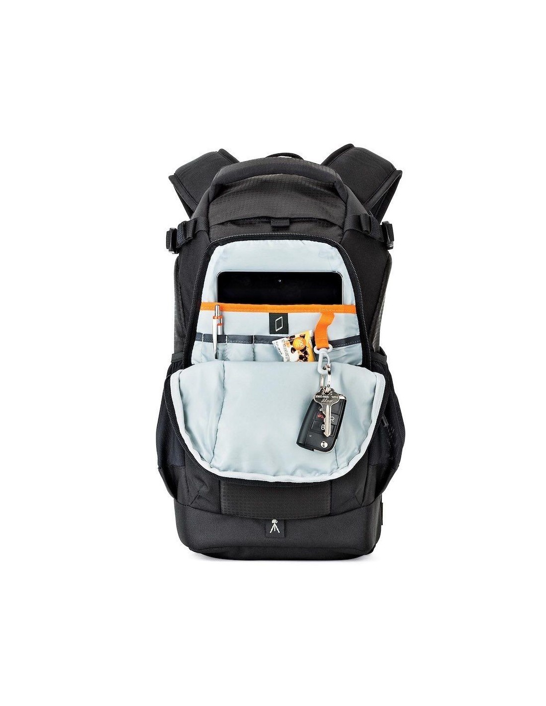 La Mochila Flipside de Lowepro incorpora dos bolsillos laterales para botellas de agua o trípodes, espacio interior ajustable, cubierta para la lluvia All Weather AW Cover™, compartimiento especial para tablet/portátil tipo CradleFit™ y enganches exteriores compatibles SlipLock™ para añadir estuches opcionales para aumentar la capacidad fácilmente.