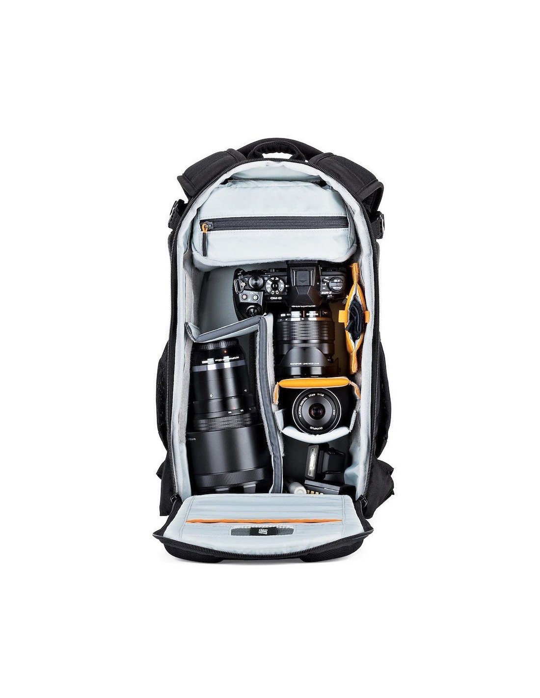 Flipside 500 AW II: La mochila más grande de la serie, con capacidad para un tablet de 10” y un portátil de 15”, cámara DSLR profesional con empuñadura y objetivo montado de hasta 400mm, o hasta 500mm sin montar o drone compacto, trípode y entre cuatro y seis objetivos adicionales.