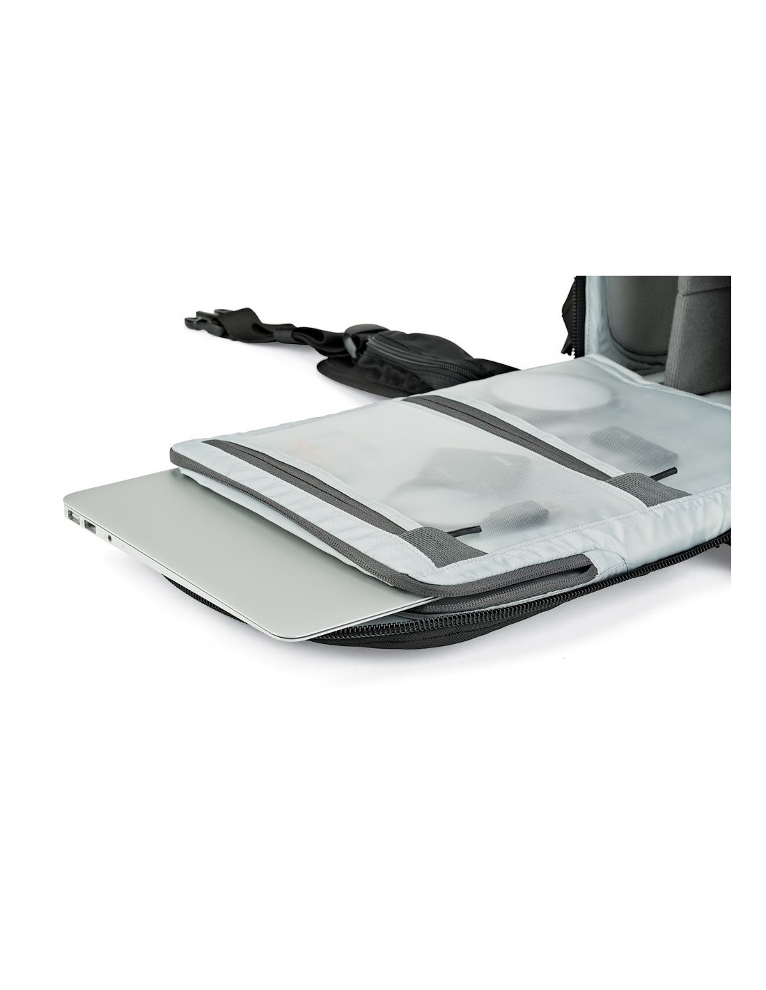 Almacenamiento para portátil CradleFit™, compartimiento de construcción inteligente para el almacenamiento y transporte del ordenador portátil en las mochilas.
