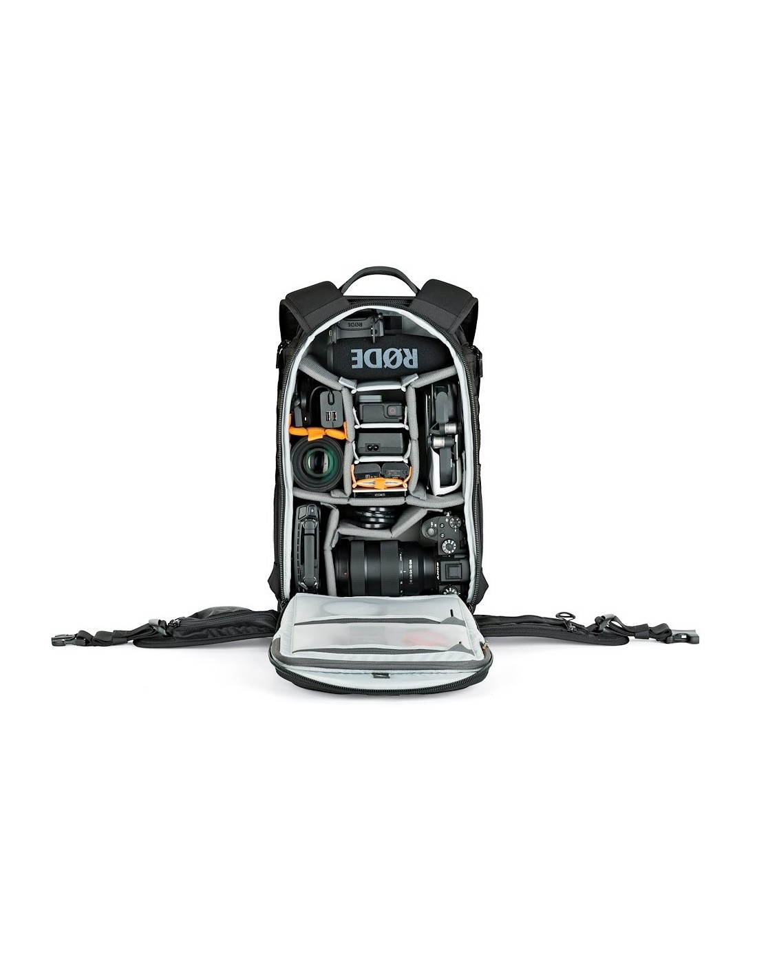 Capacidad para 1-2 DSLRs estándar, una con objetivo 24-70mm f/2.8 montado, hasta 8 objetivos, Mavic, Osmo, cámara 360, portátil hasta 13” y pequeños accesorios.