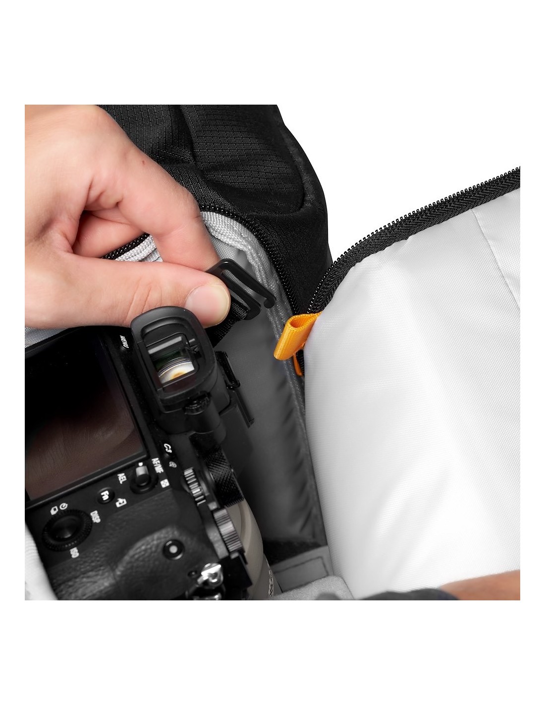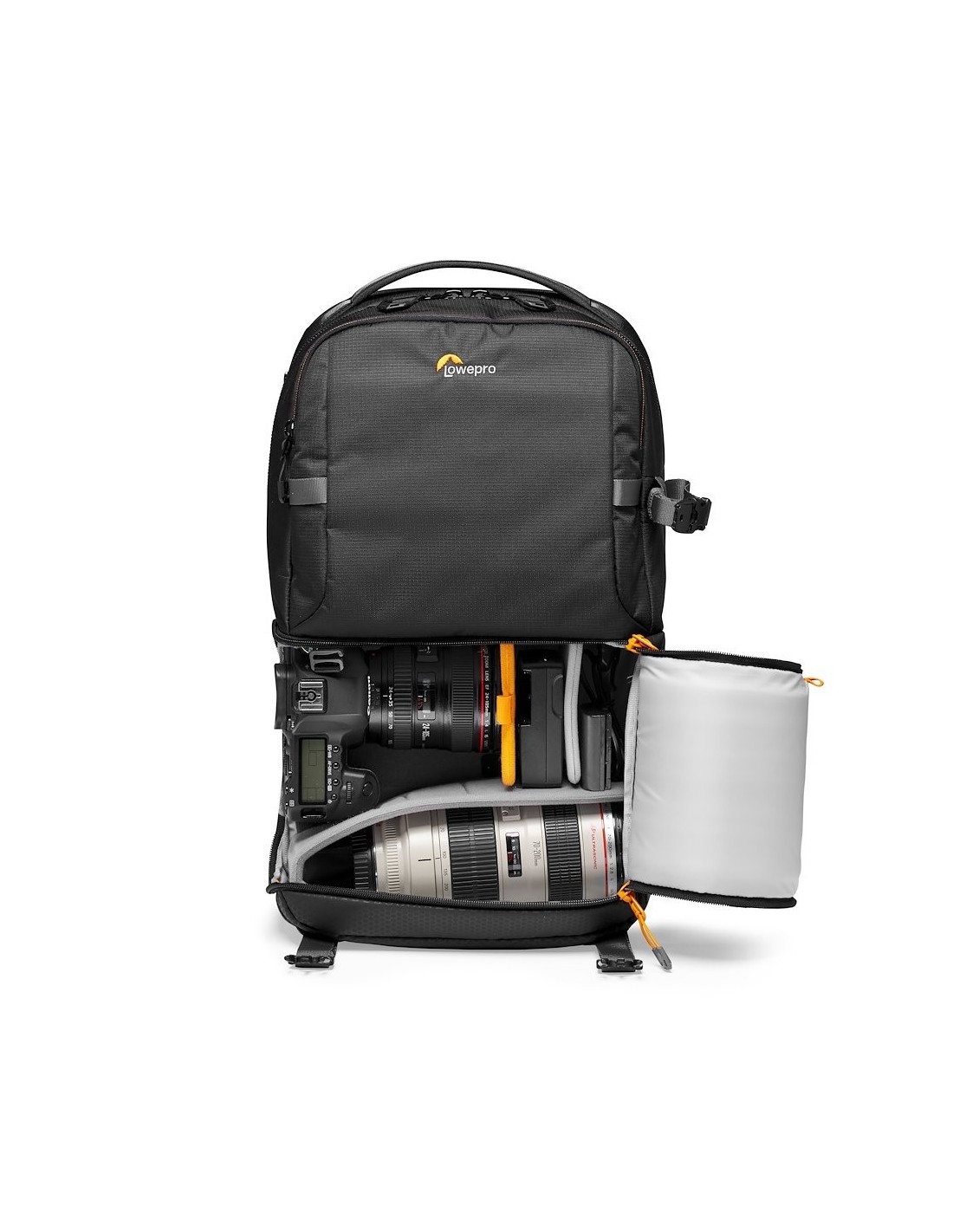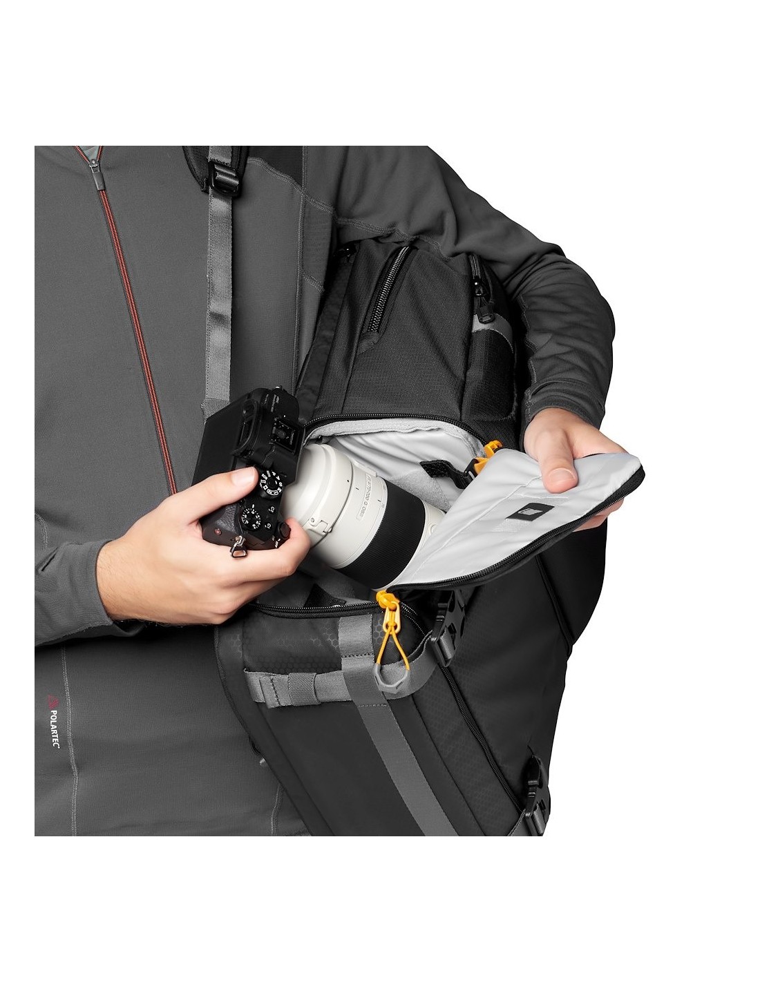 La Mochila FASTPACK BP 250Se adapta a las cámaras mirrorless o DSLR con objetivos adicionales o al kit de drones plegable.