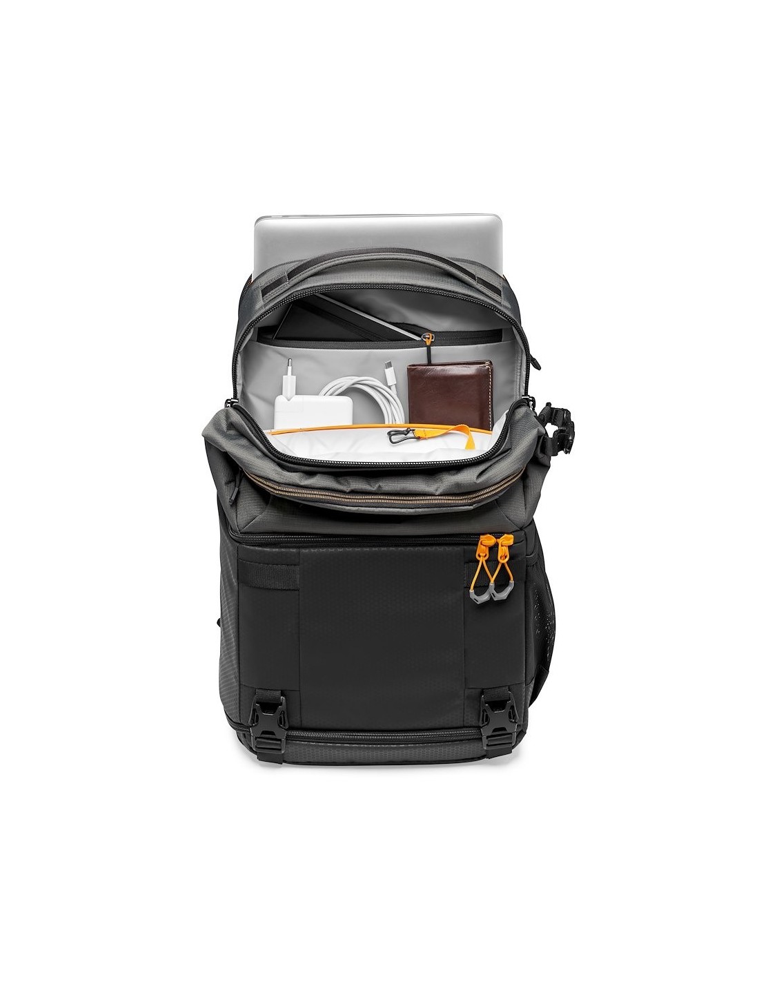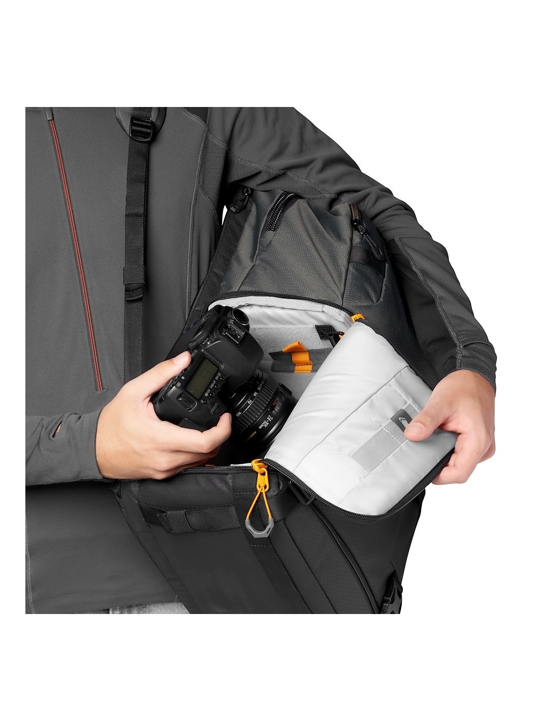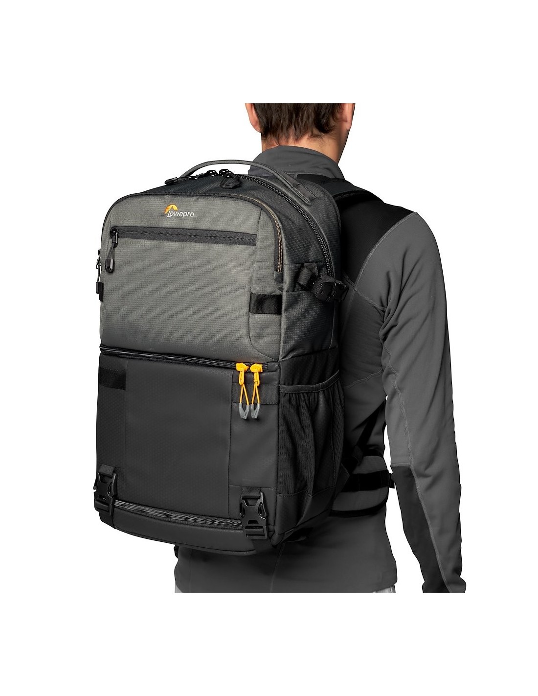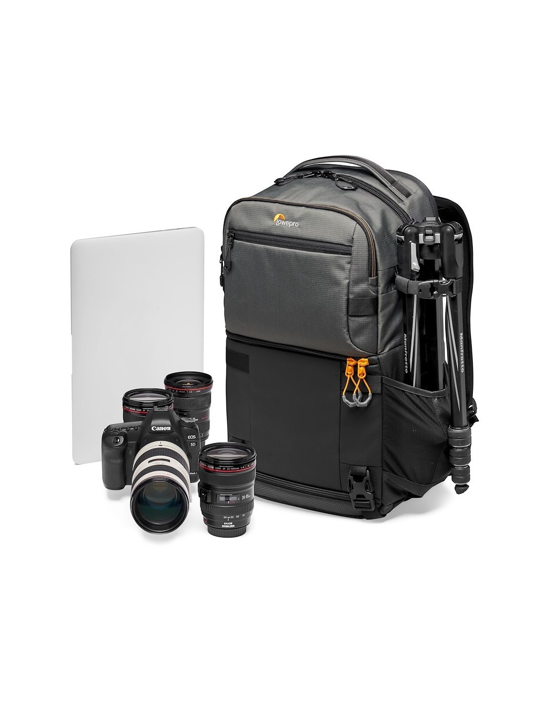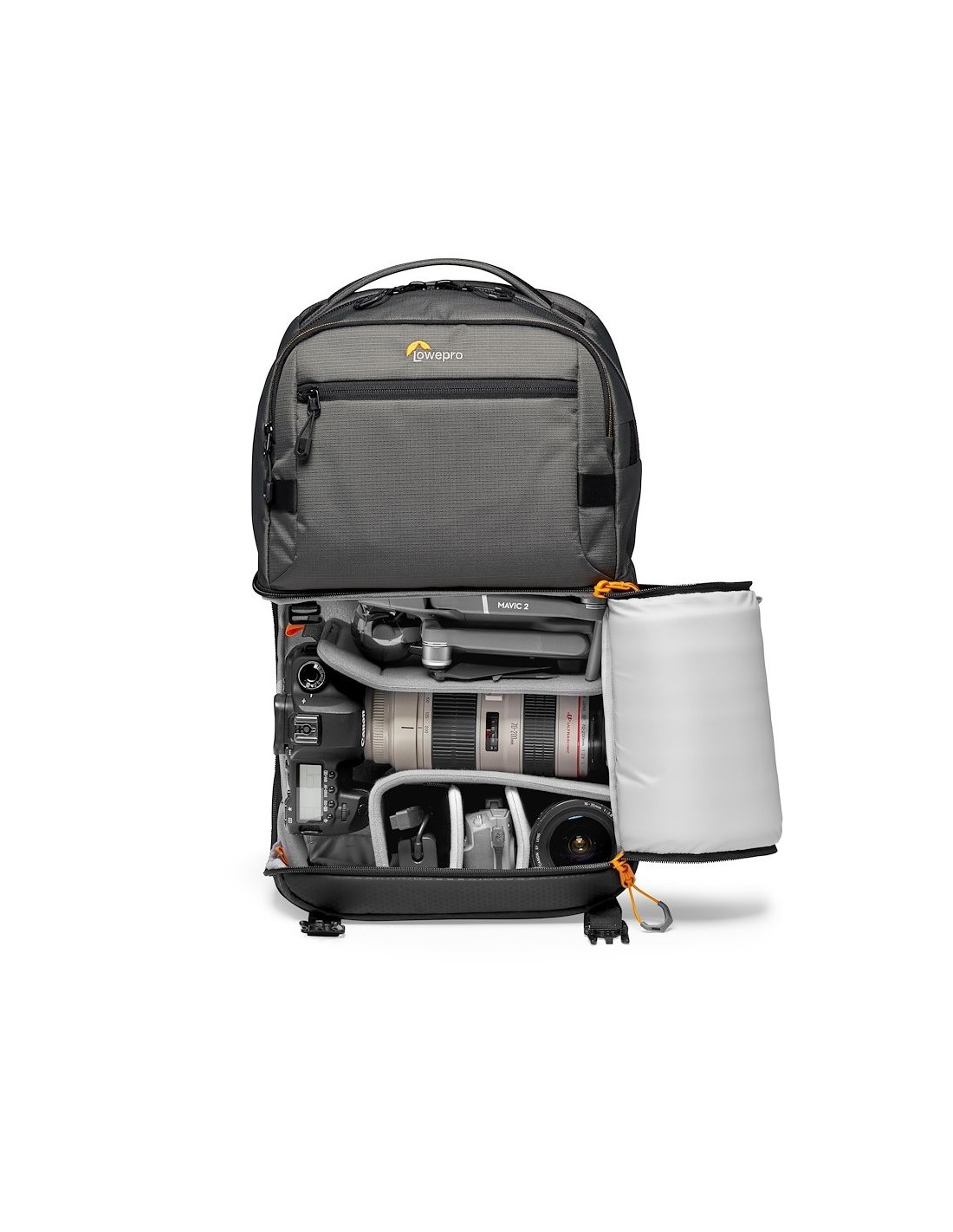 La Mochila que se adapta esa es la Fasrpack PRO BP 250 AW III de Lowepro, transporta una mirrorless , DSLR con empuñadura para retratos o a un kit de drones plegable o cualquier otro equipo.