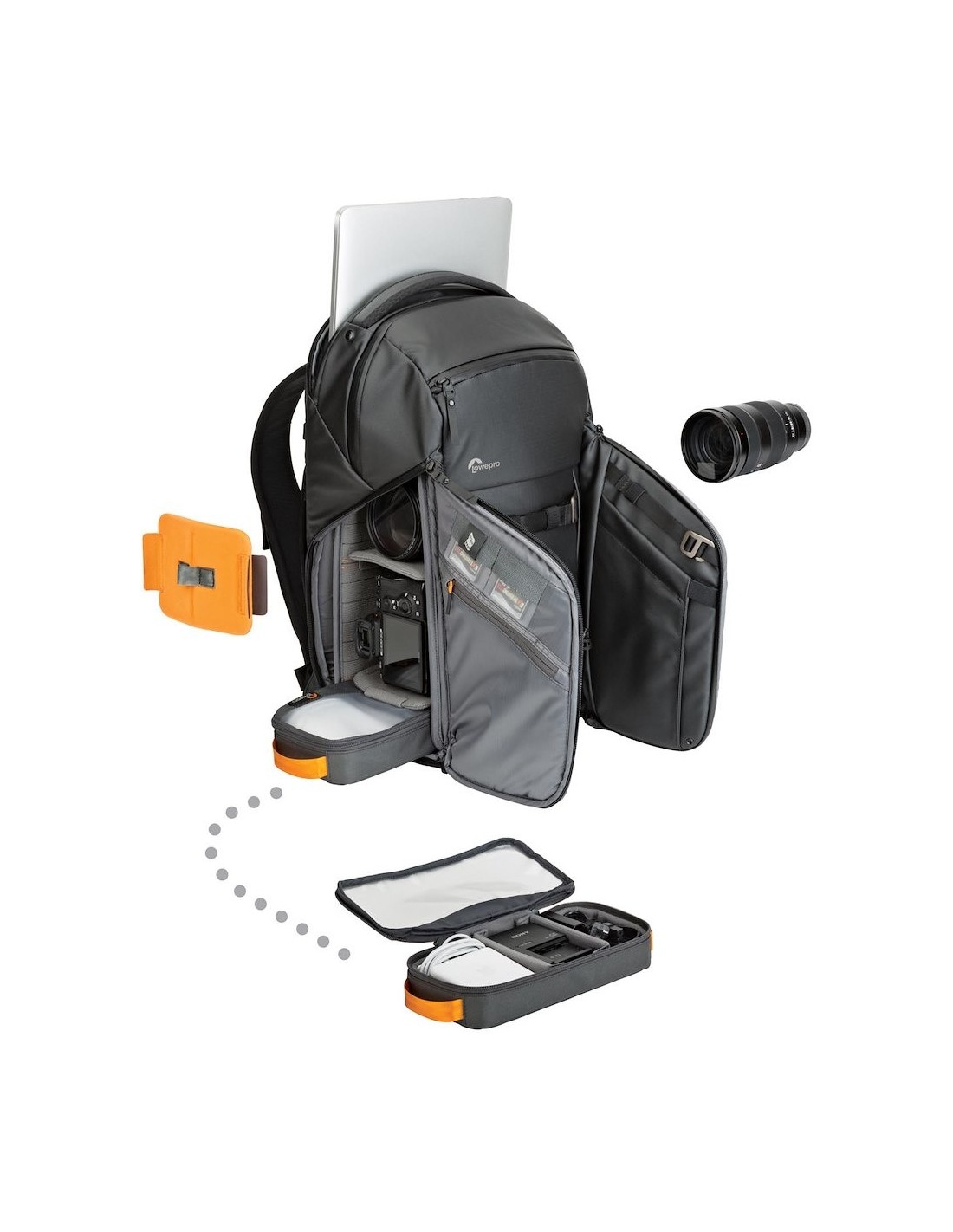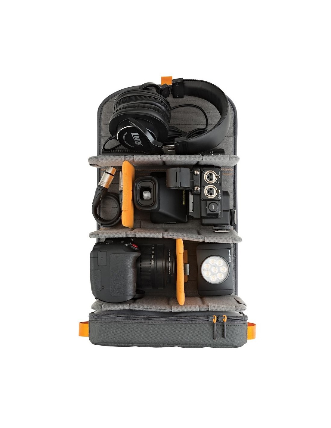 Incluye divisores laterales tipo ‘pop-in’, que permiten el transporte y almacenamiento de diferentes configuraciones de equipo, como por ejemplo diversos cuerpos y objetivos CSC / Mirrroless; una DSLR full-frame con un objetivo 70-200mm f2.8 montado y objetivos extra, drones compactos y más.