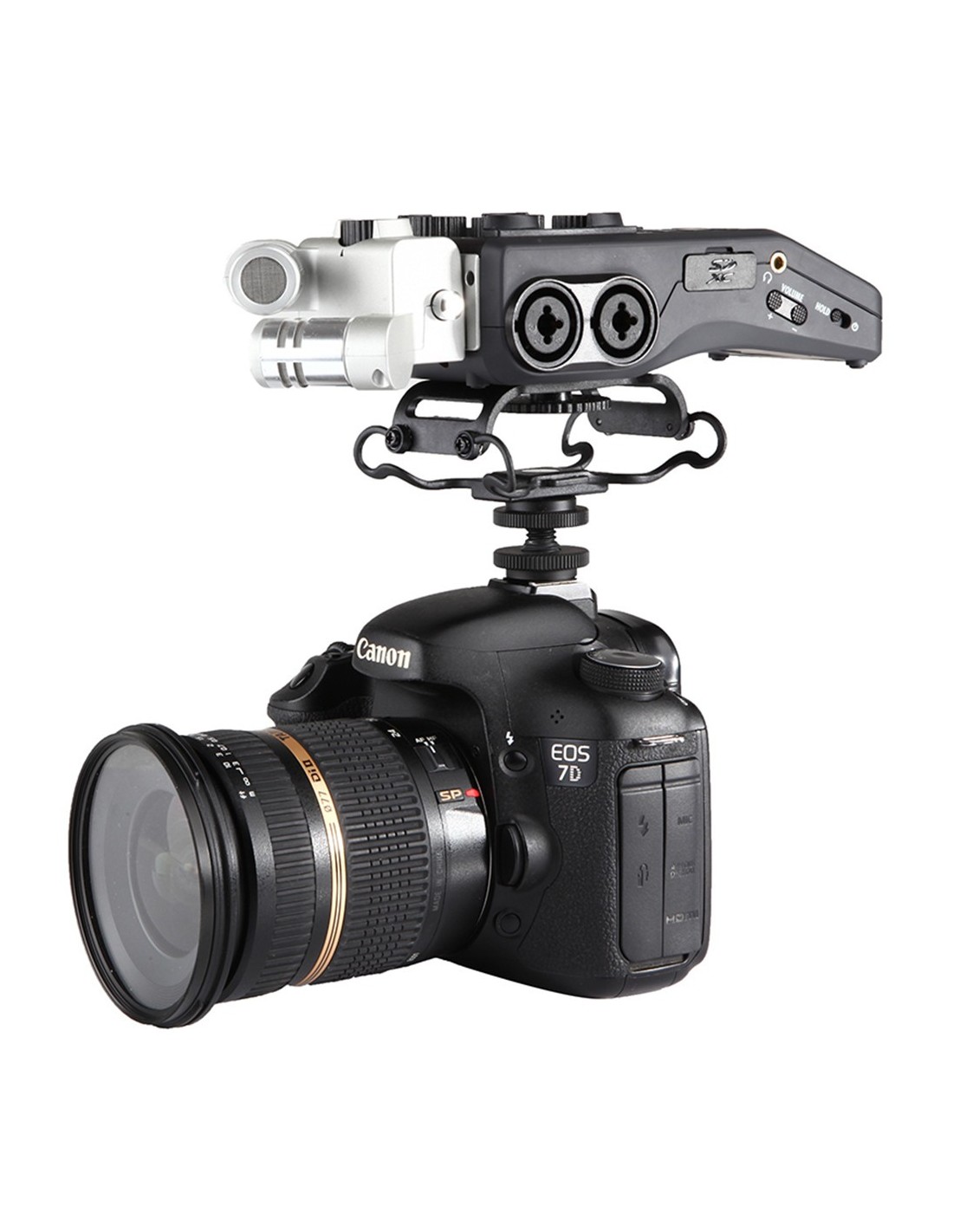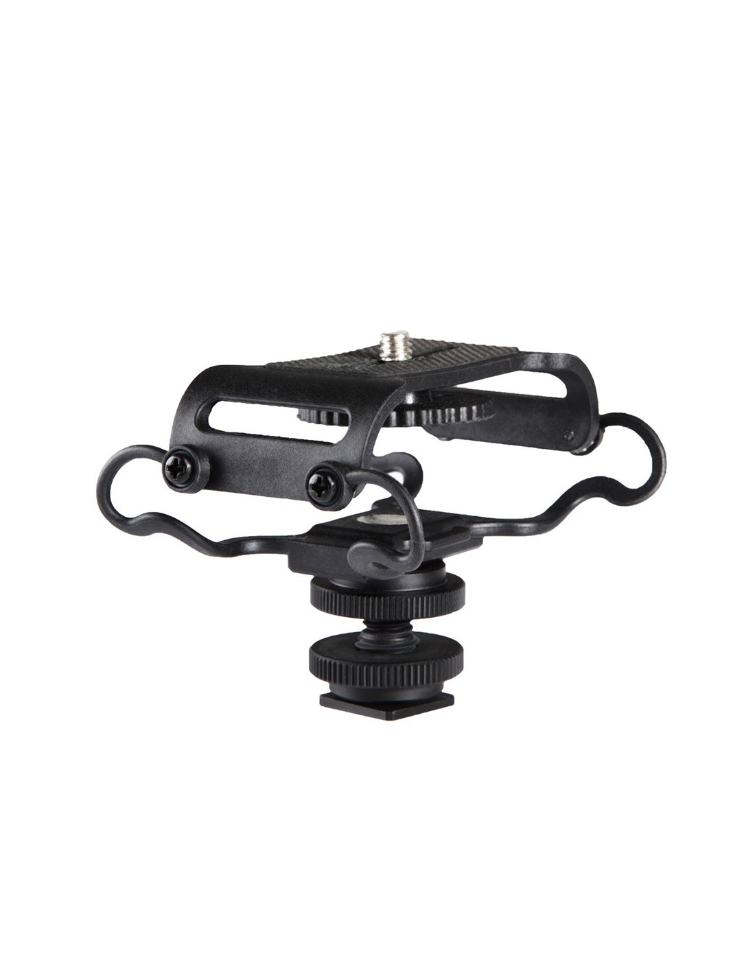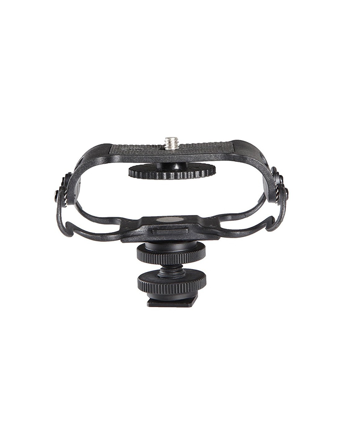 Soporte para sujetar la grabadora de audio sobre la cámara o videocámara que minimiza y aisla el ruido originado por manejo, vibraciones etc.