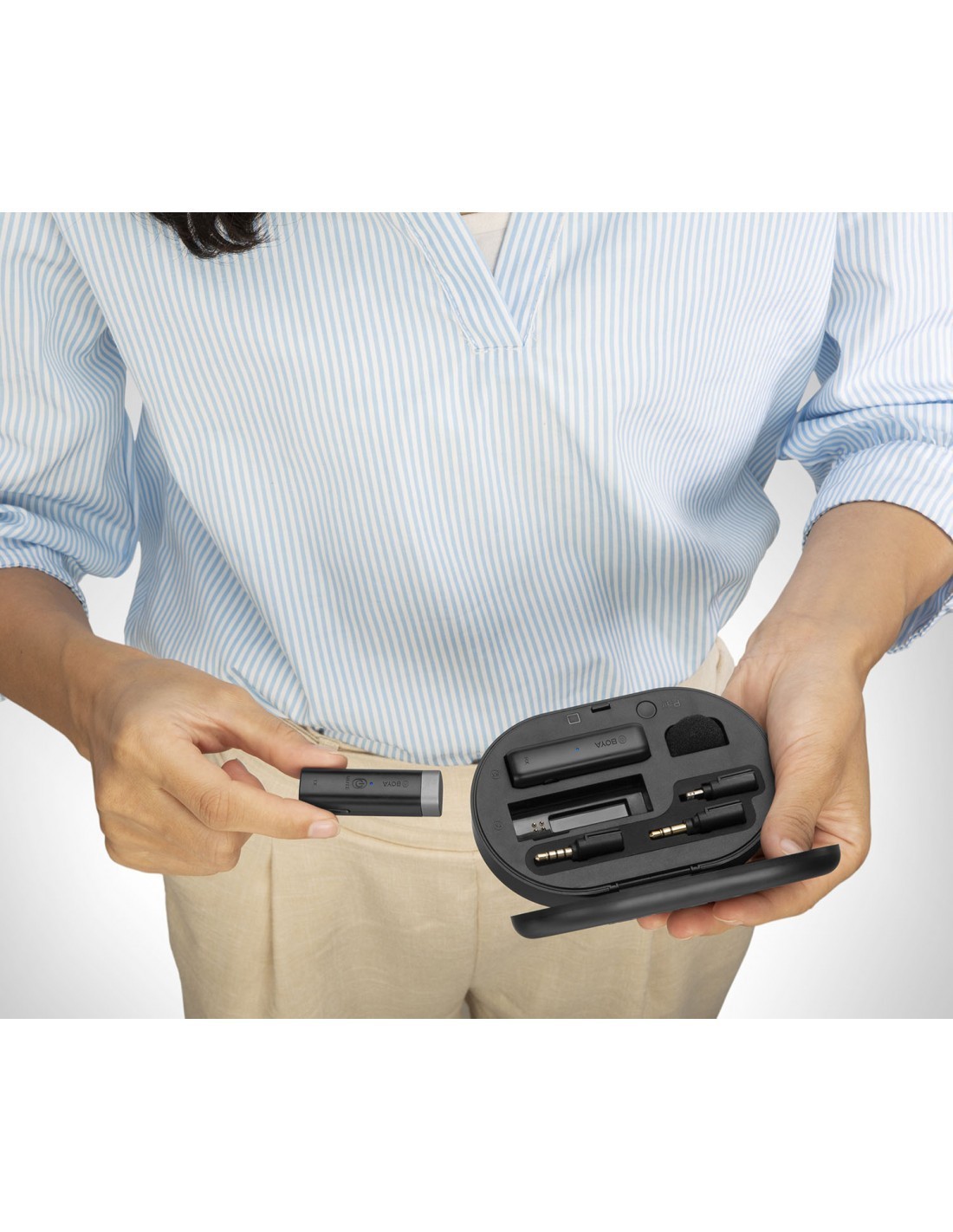 La caja de almacenamiento de BOYA BY-WM3U también es donde emparejar y cargar el transmisor y el receptor.