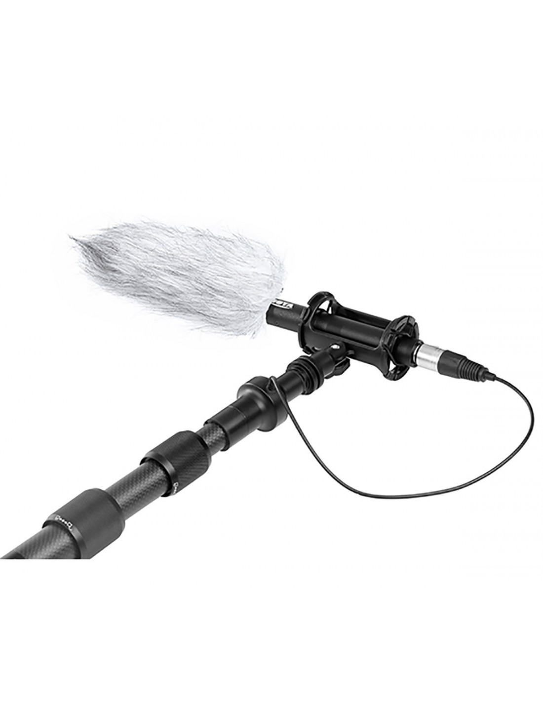 Esta pértiga presenta un cable en espiral interno y una conexión XLR en la base.