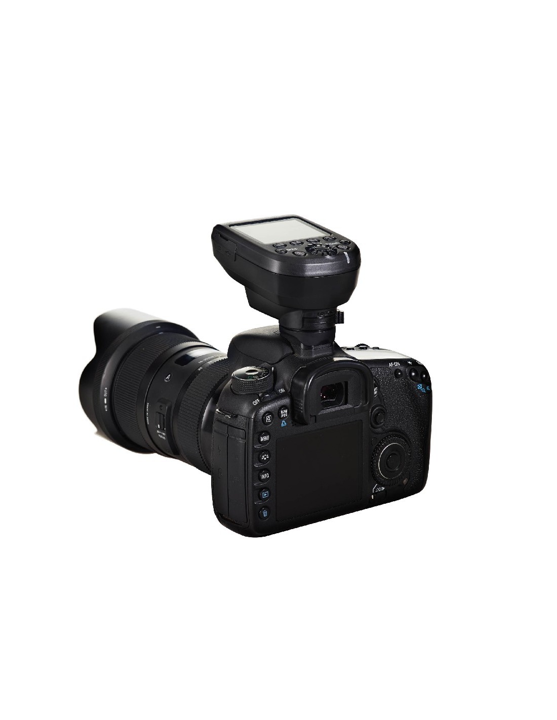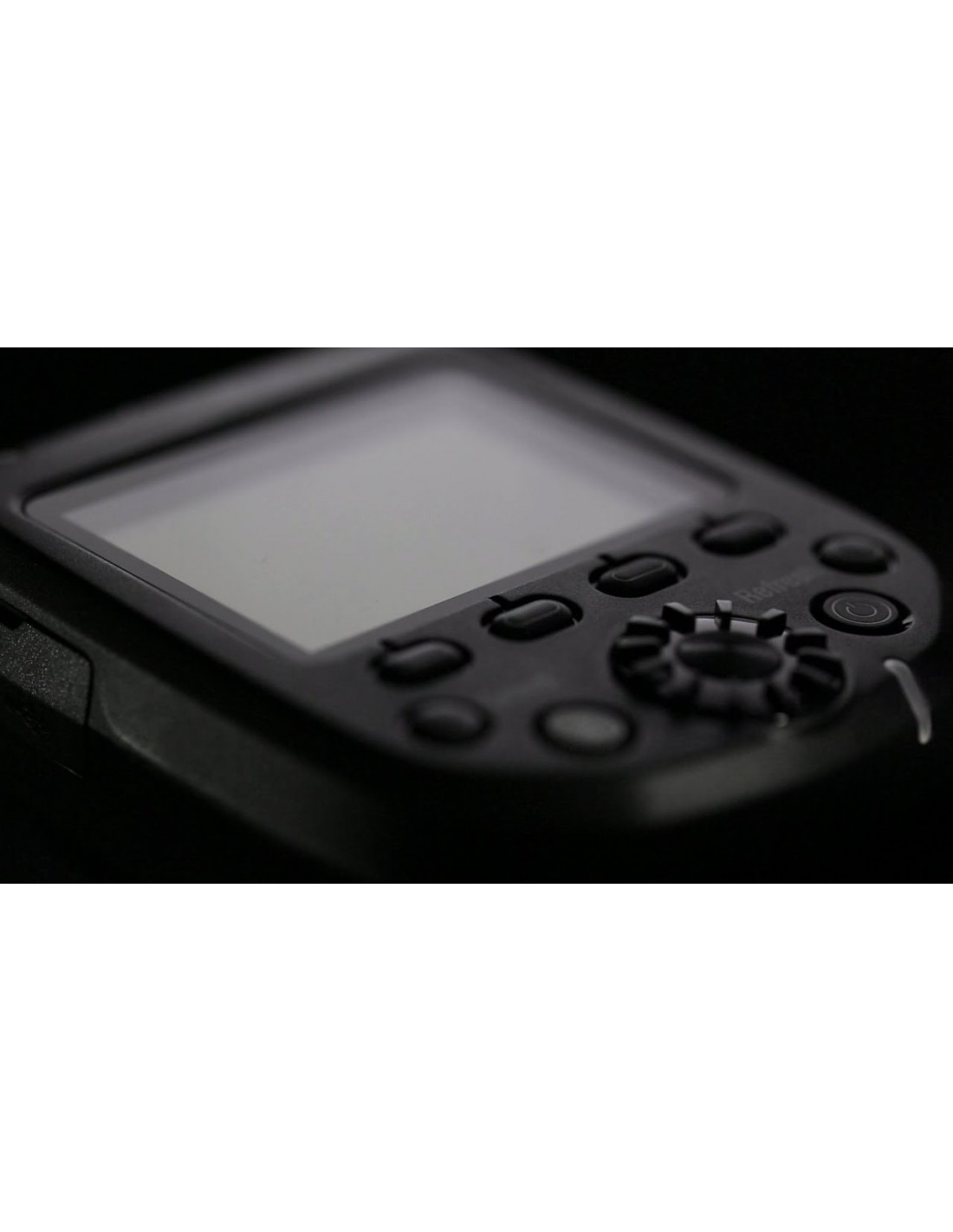| Indicadores y controles | Pantalla con display LCD: Modo de sincronización, grupo, canal, activación ODS (solo Canon), activación Hi-Sync (HS), activación High Speed Sync (HSS), modo de disparo, indicador batería, nombre del flash, ID del flash, potencia del flash, nivel de lámpara de modelado. Botones: Selección de grupo, test, rueda giratoria para cambio de valores, confirmación, on/off y refresco. Hay también 4 botones con funciones variables: potencia +/-, lámpara de modelado off/prop/libre, selección individual de unidades y ajuste en el tablero. Menú arriba, menú abajo y salida. |