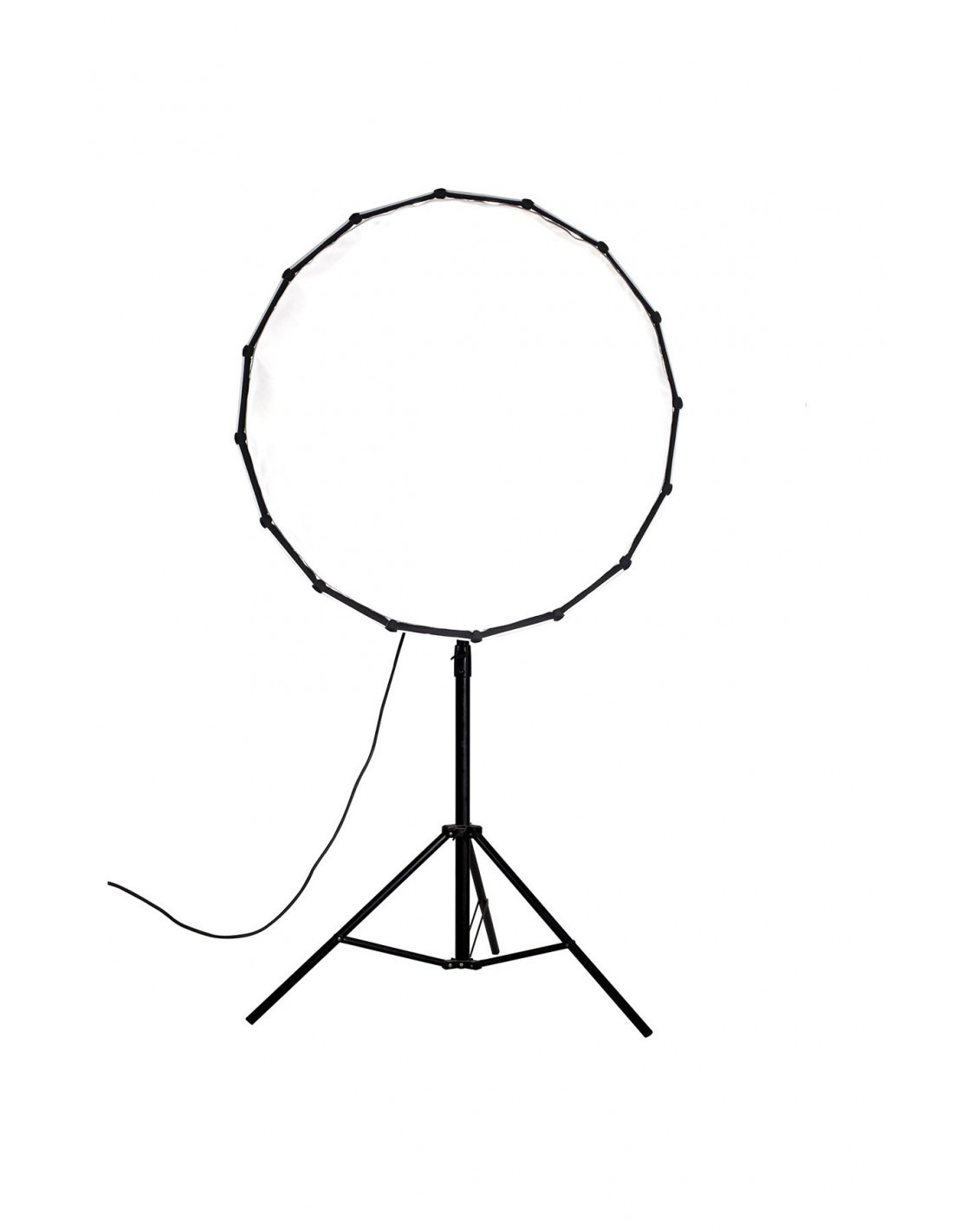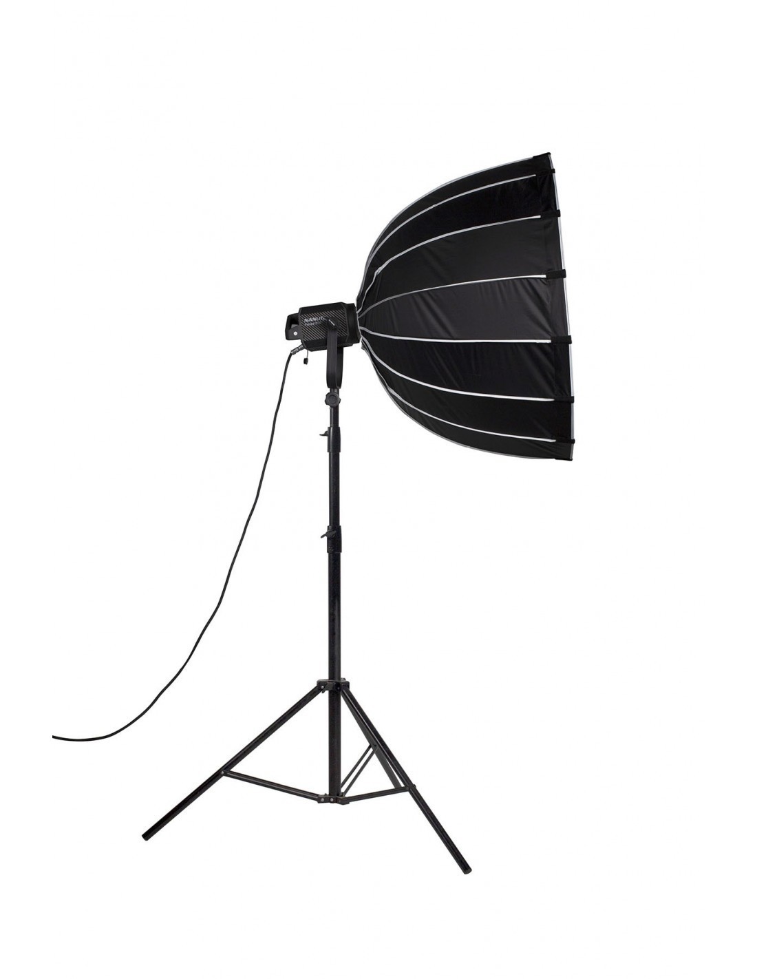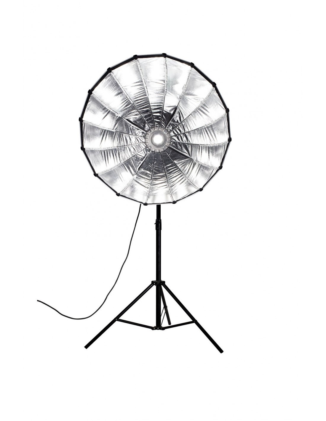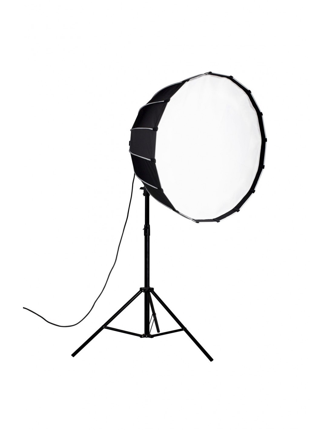 Con 90 cm de diámetro, su estructura está soportada por 16 varillas de acero. Su superficie interior reflectante en plata potencia la salida de luz, y sus dos difusores interno y externo son extraíbles. Este softbox parabólico genera una luz suave con bordes definidos, con apariencia de luz natural, idóneo para sesiones de retrato y moda.