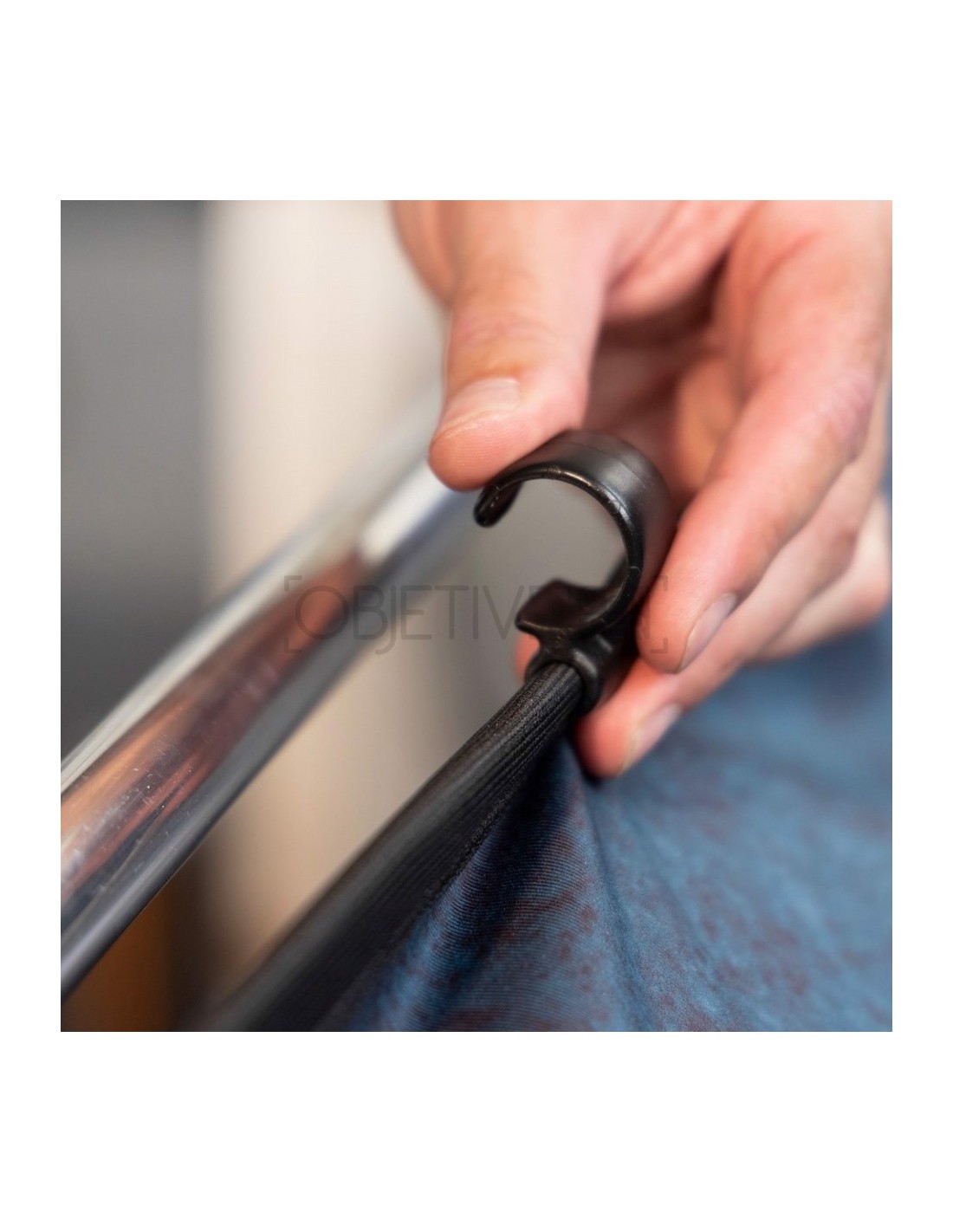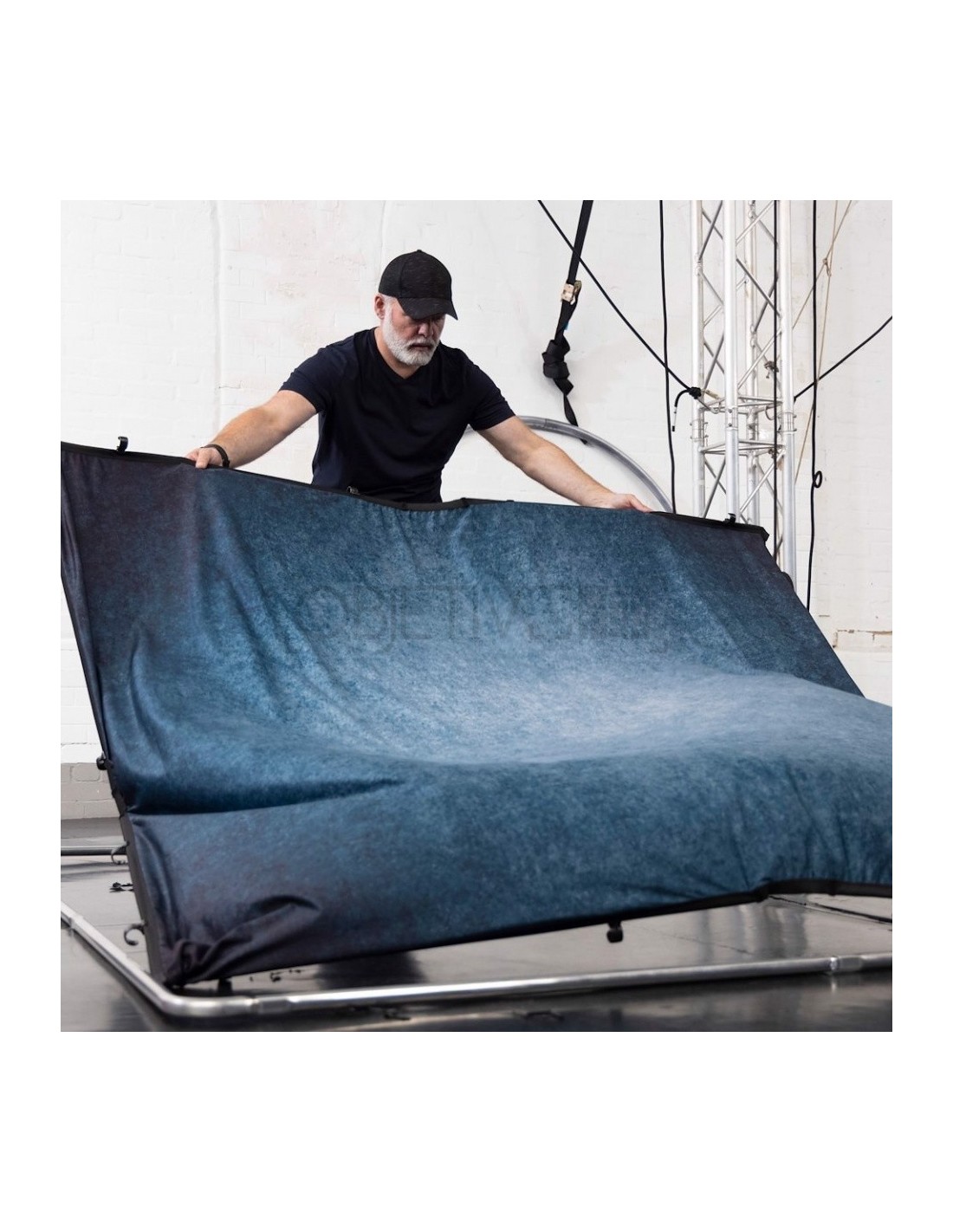 a cubierta del fondo EzyFrame incluye un pequeño faldón de 15 cm a lo largo de su borde inferior, que oculta el bastidor de aluminio y permite que el usuario combine el fondo con una superficie de suelo que haya elegido para capturar imágenes de longitud completa.