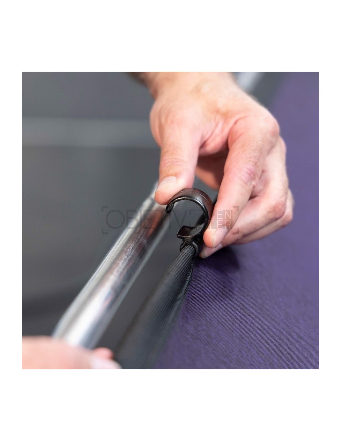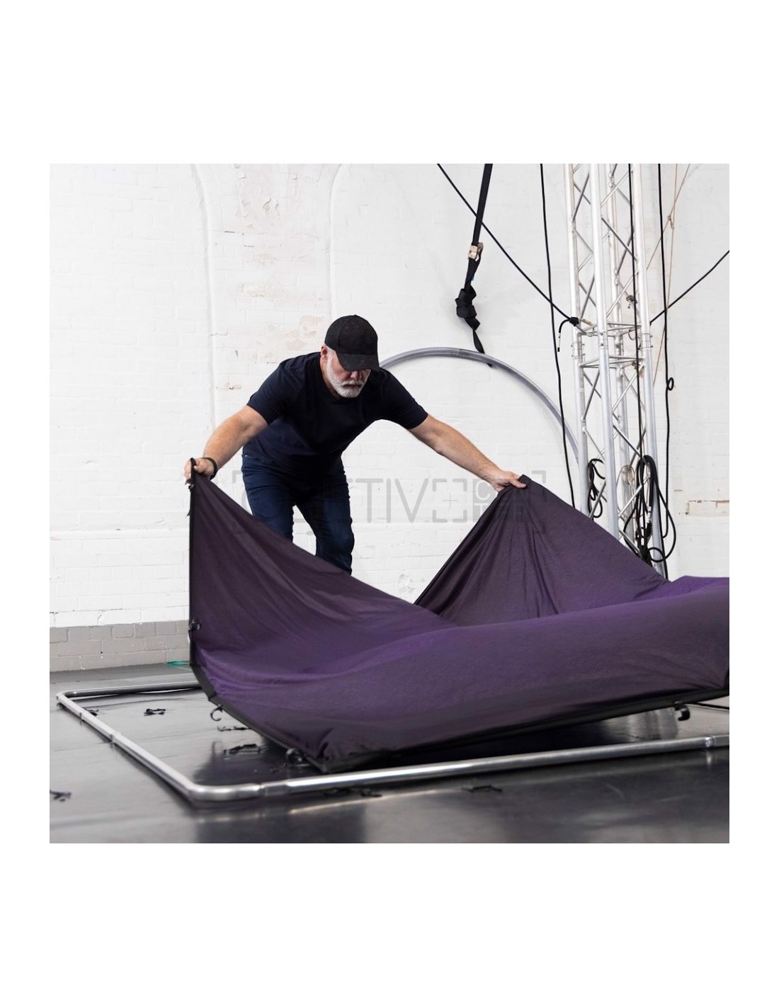 a cubierta del fondo EzyFrame incluye un pequeño faldón de 15 cm a lo largo de su borde inferior, que oculta el bastidor de aluminio y permite que el usuario combine el fondo con una superficie de suelo que haya elegido para capturar imágenes de longitud completa.