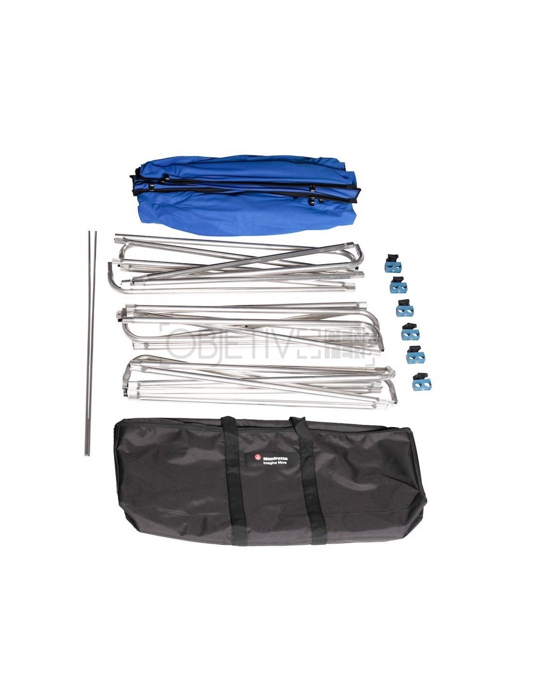 El kit de fondo Chroma Key FX 4X2,9M Azul de Manfrotto incluye: Tres bastidores de aluminio para montaje ultra rápido, una cubierta de croma abrochable en color azul, cuatro ganchos articulados, dos barras tensoras y una bolsa de transporte.