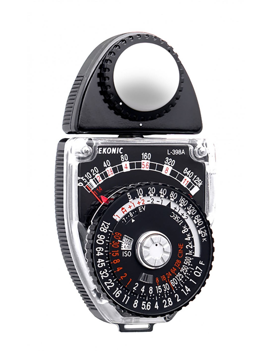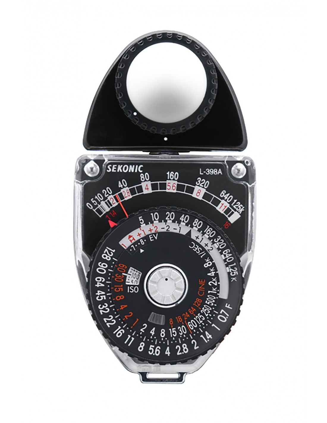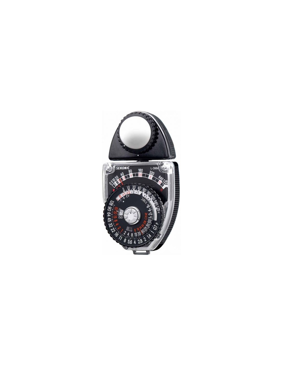 El fotómetro Sekonic L-398A es un fotómetro de luz analógico del tamaño de la palma de la mano que mide lecturas de luz ambiente incidente y reflejada.