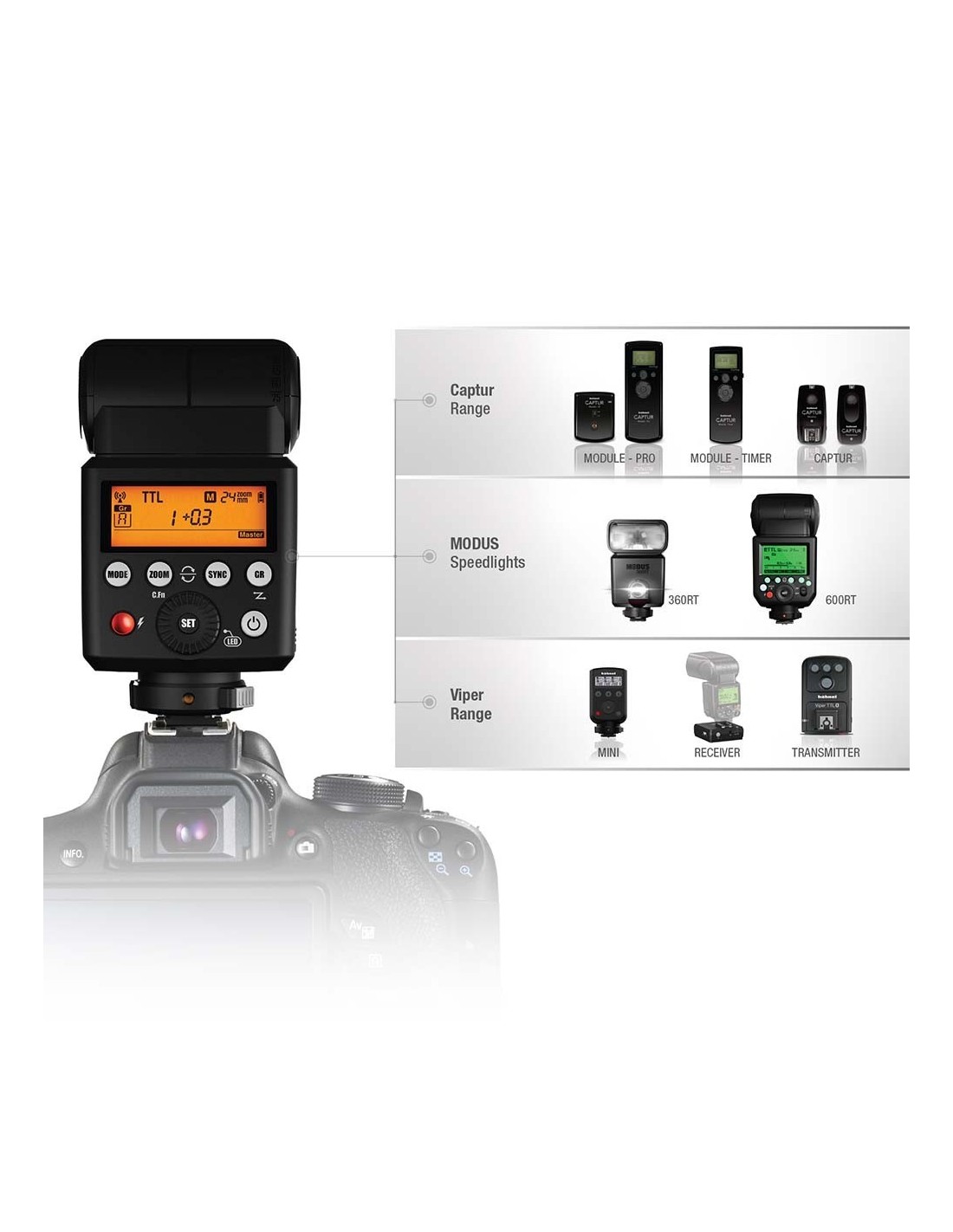 El Modus 360RT es un flash transceptor, que incorpora emisor y receptor inalámbrico vía radio, lo que permite una integración total en el sistema completo de flash inalámbrico Hähnel, lo que garantiza la compatibilidad entre los Modus 360RT, 600RT y los triggers Viper TTL.
