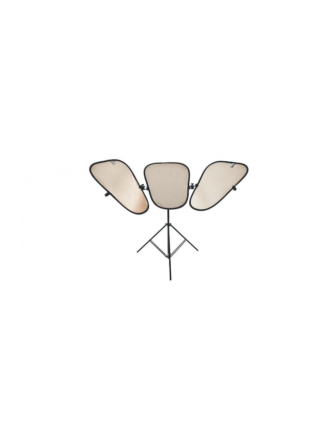 El Triflector MKII marco y soporte con paneles Sunfire/ Plata de Manfrotto, es un kit compuesto por un marco triple con tres reflectores de doble cara, con bisagras para el posicionamiento individual de cada panel y un soporte.