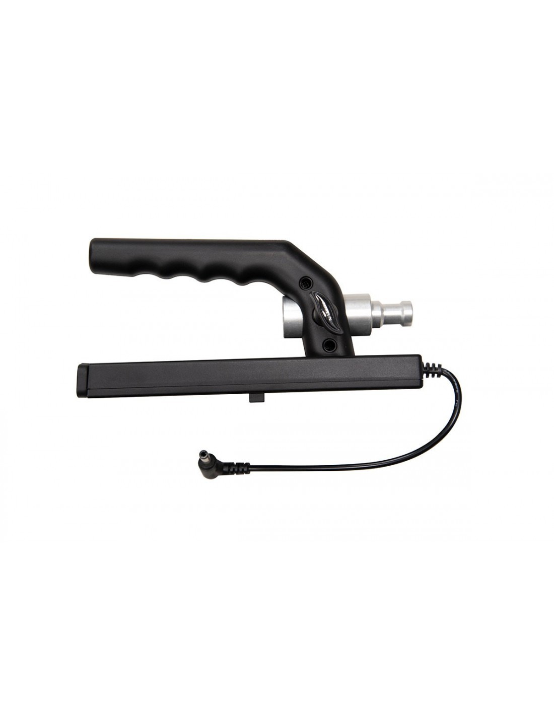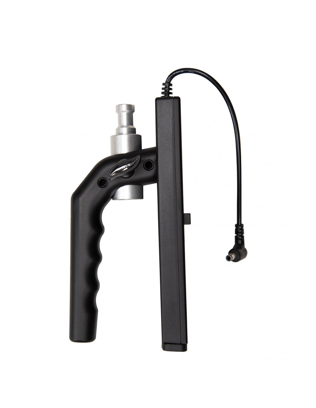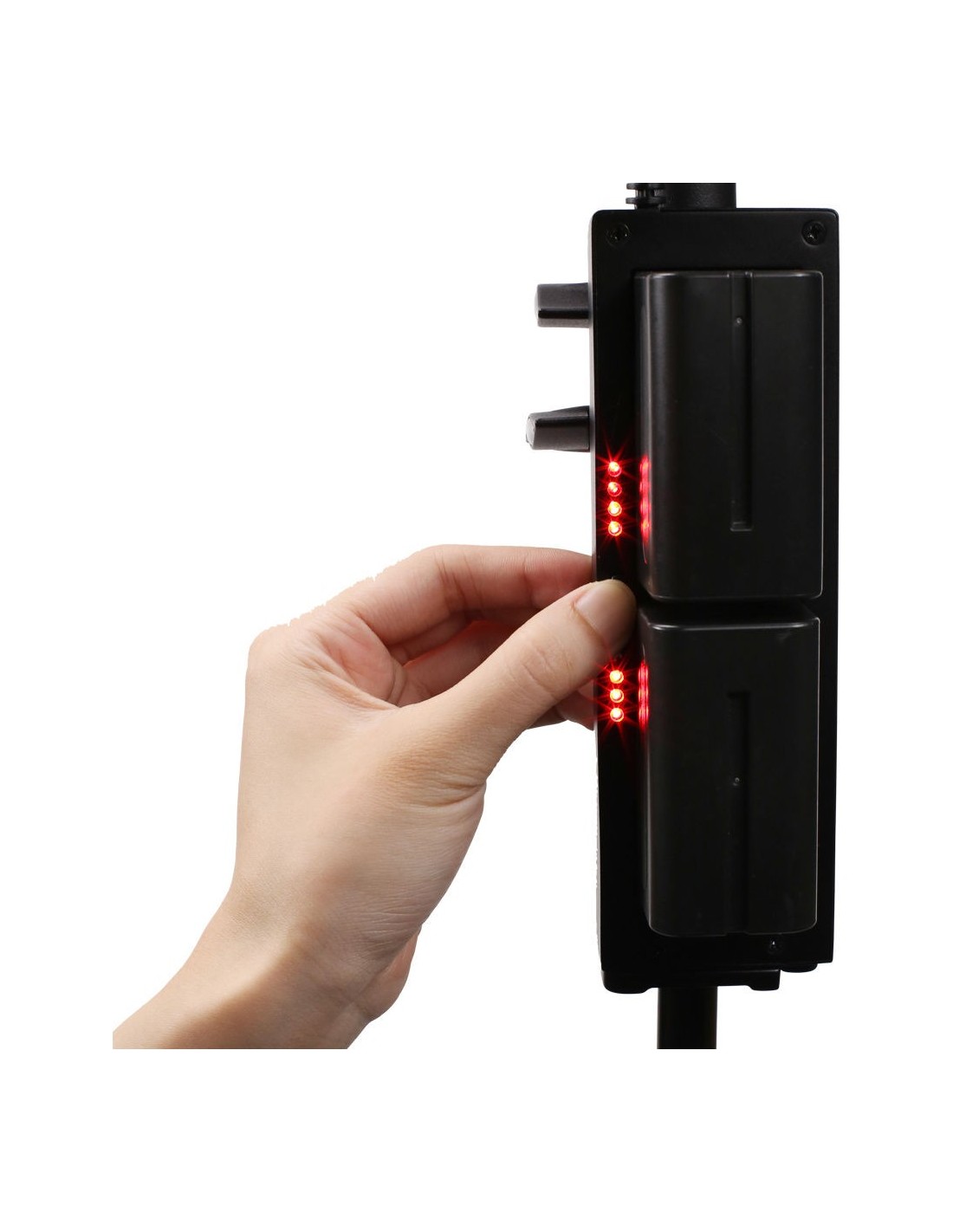 Adaptador de batería dual con montaje NP-F con asa para uso manual y un soporte de 1 / 4- 20 "para colocarlo en un pie, además se puede utilizar directamente como pie de sobremesa. Indica la carga de las baterías.