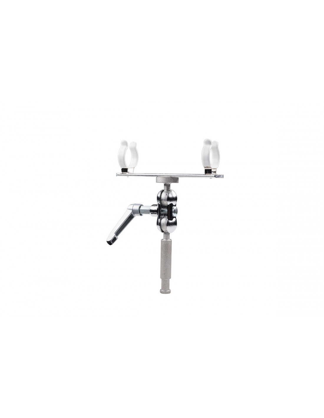 Este soporte termina en un pasador de bebé de 5/8 de pulgada compatible con todos los cabezales de agarre estándar y cuenta con una rótula giratoria para la articulación.