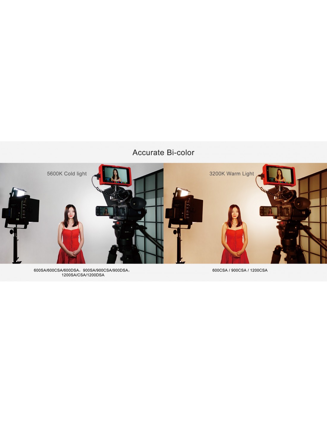El 1200CSA emplea un módulo LED de alto rendimiento de 1200 para producir hasta 4536 lúmenes de luz (5015 Lux @ 1m 5600K) mientras mantiene un CRI / TLCI alto de 95/93, lo que garantiza una reproducción precisa del color.