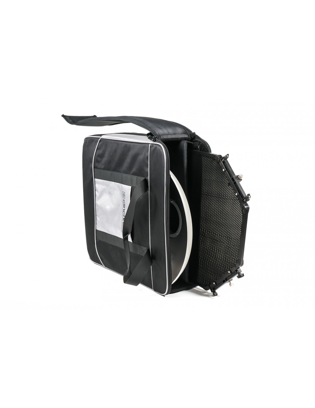 Kit compuesto por un Softlite o disco Beauty fondo plata, tela difusora, nido de abeja, juego de deflectores y mochila de transporte y protección.