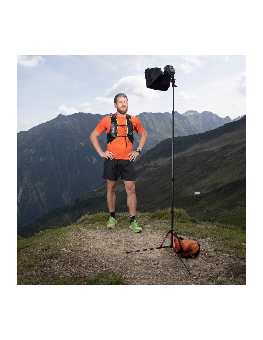Incluso se desliza cuidadosamente en la bolsa del trípode en el costado de la mayoría de las bolsas de la cámara para garantizar que el usuario pueda mantener su kit compacto y viajar ligero sin comprometer los requisitos de su kit de iluminación.