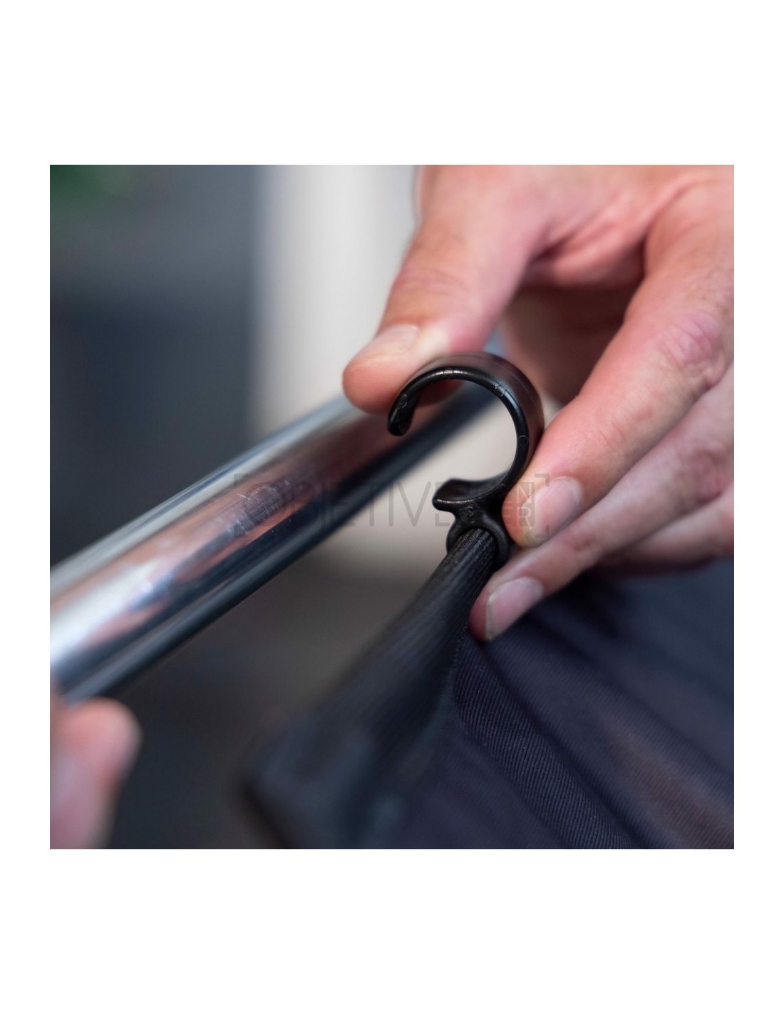 a cubierta del fondo EzyFrame incluye un pequeño faldón de 15 cm a lo largo de su borde inferior, que oculta el bastidor de aluminio y permite que el usuario combine el fondo con una superficie de suelo que haya elegido para capturar imágenes de longitud completa.