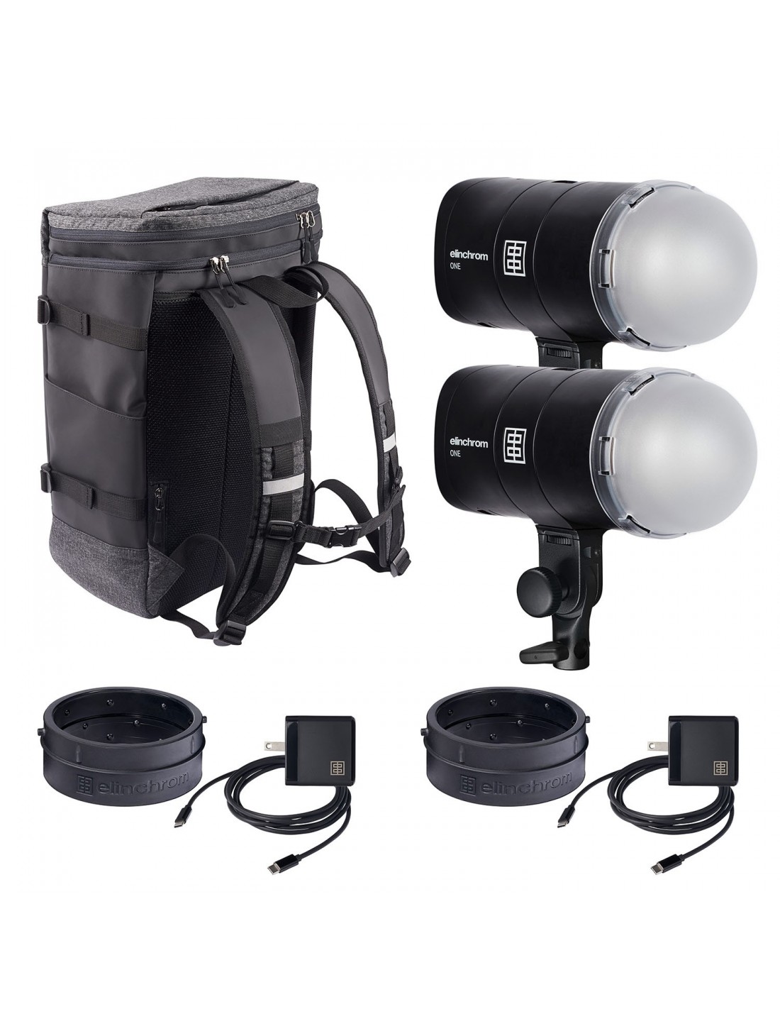 Kit compuesto por dos unidades de flash Elinchrom ONE, un adaptador OCF, capuchón difusor OCF, cargador de pared, un cable USB-C y una maleta Elinchrom ONE de transporte y Protección.