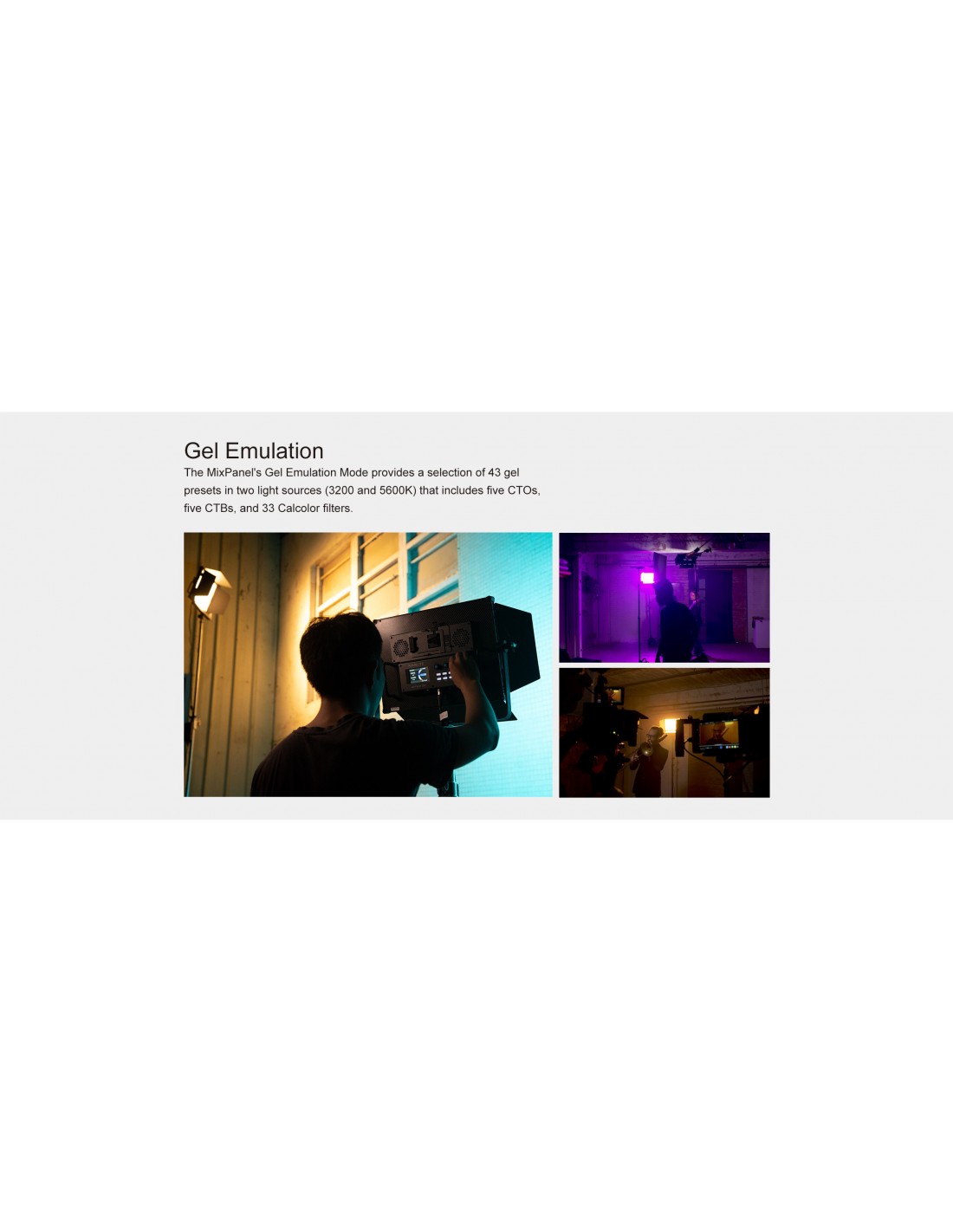 Tres fuentes de luz LED en un panel compacto. Nanlite MixPanels es capaz de cambiar entre un panel multi-LED "tradicional" para luz intensa, un panel LED SMD difuso para luz suave y un panel RGB sintonizable para efectos creativos y coloridos con solo presionar un botón. Ahora, ya sea que el proyecto requiera iluminación intensa con más proyección, iluminación difusa para retratos evocadores y trabajo de cerca, o luz de colores para establecer estados de ánimo y expresar emociones, los creadores pueden hacerlo todo en una unidad sin accesorios adicionales.