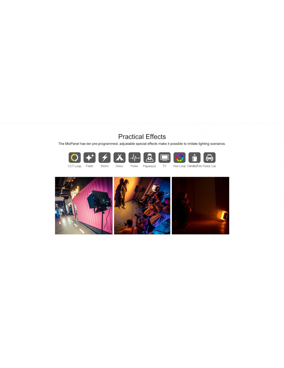 Tres fuentes de luz LED en un panel compacto. Nanlite MixPanels es capaz de cambiar entre un panel multi-LED "tradicional" para luz intensa, un panel LED SMD difuso para luz suave y un panel RGB sintonizable para efectos creativos y coloridos con solo presionar un botón.