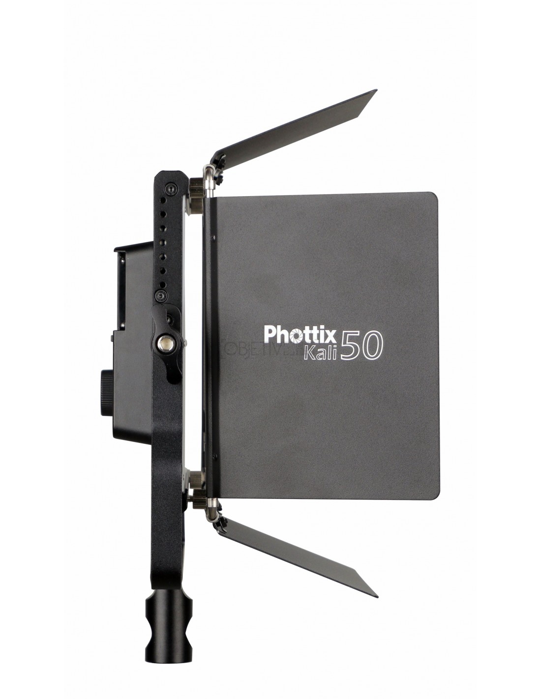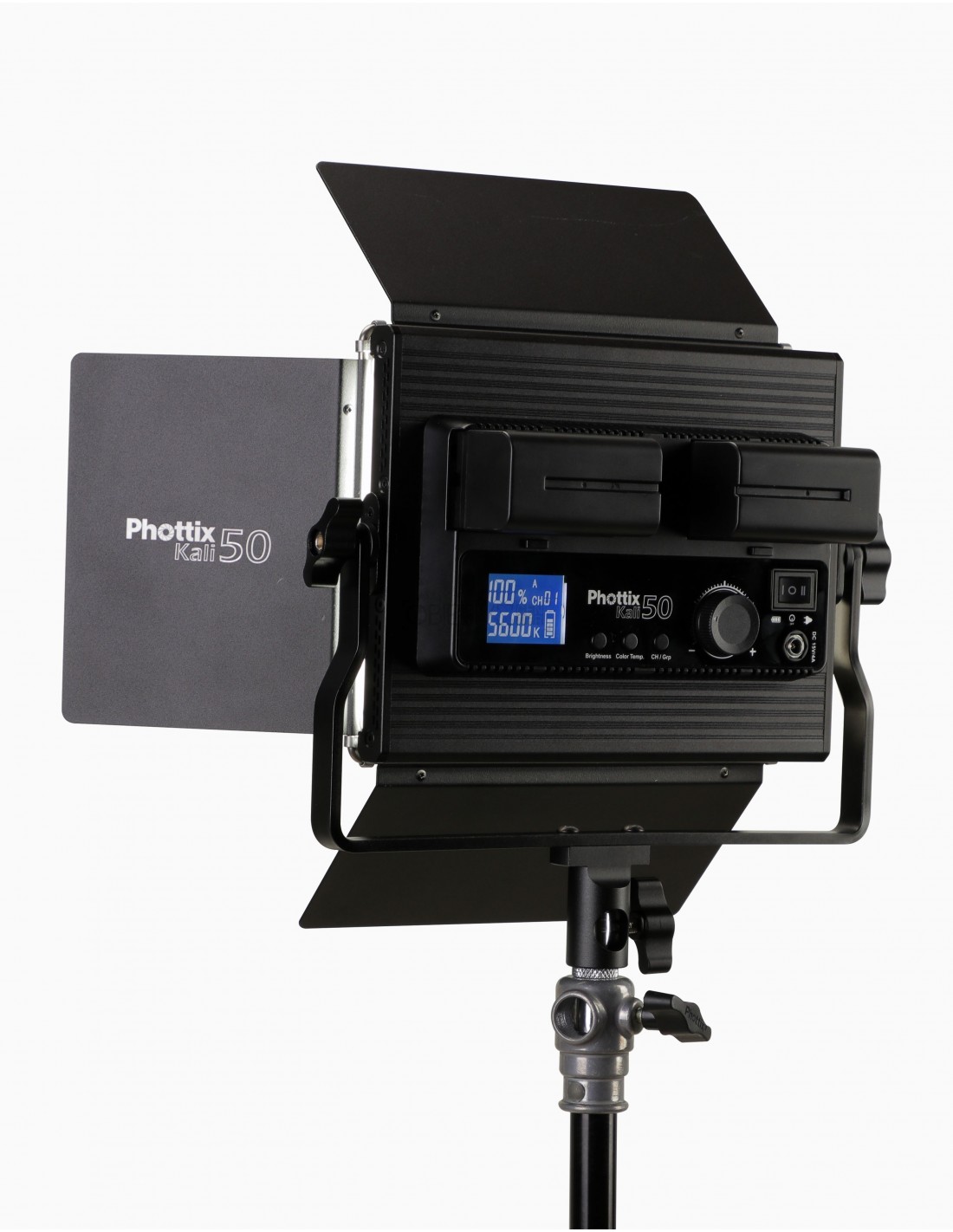 Gracias al sistema Phottix LED Ecosystem (ECO1) Kali 50 puede trabajar conjuntamente con los paneles led Phottix R3II y R4II, se pueden configurar tres grupos de trabajo diferentes (A/B/C) y hasta 40 canales. Kali50 funciona con dos baterías de la serie NP compatibles con Sony (no incluidas), e incluye viseras y un alimentador AC directo a la red eléctrica.