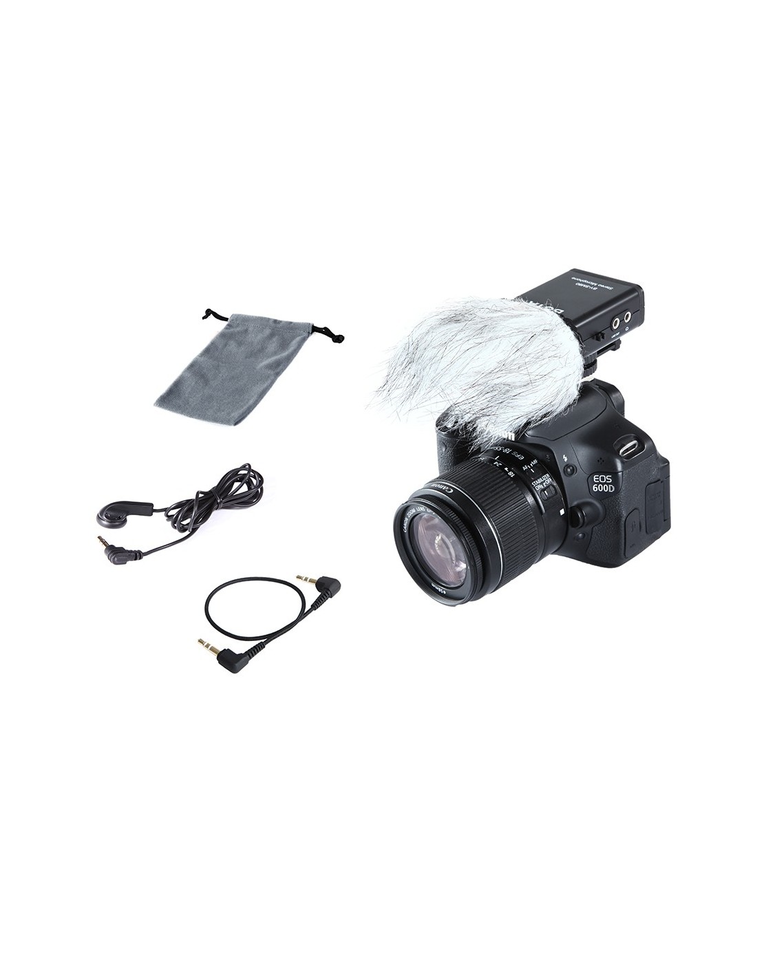 Compacto y ligero, incorpora nivel de grabación ajustable, filtro de paso alto on/off y pantalla antiviento profesional para reducir al mínimo el ruido ambiente. Se monta directamente sobre la cámara o videocámara por su zapata con soporte antichoque incorporado. Además permite monitorizar el sonido a través del auricular.