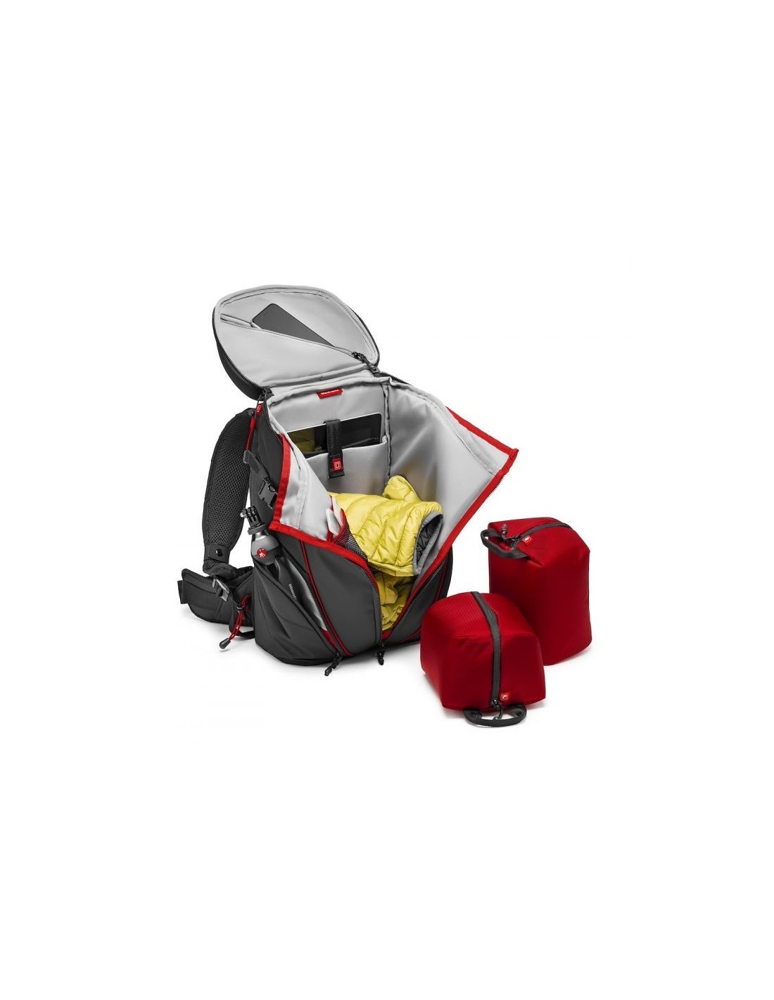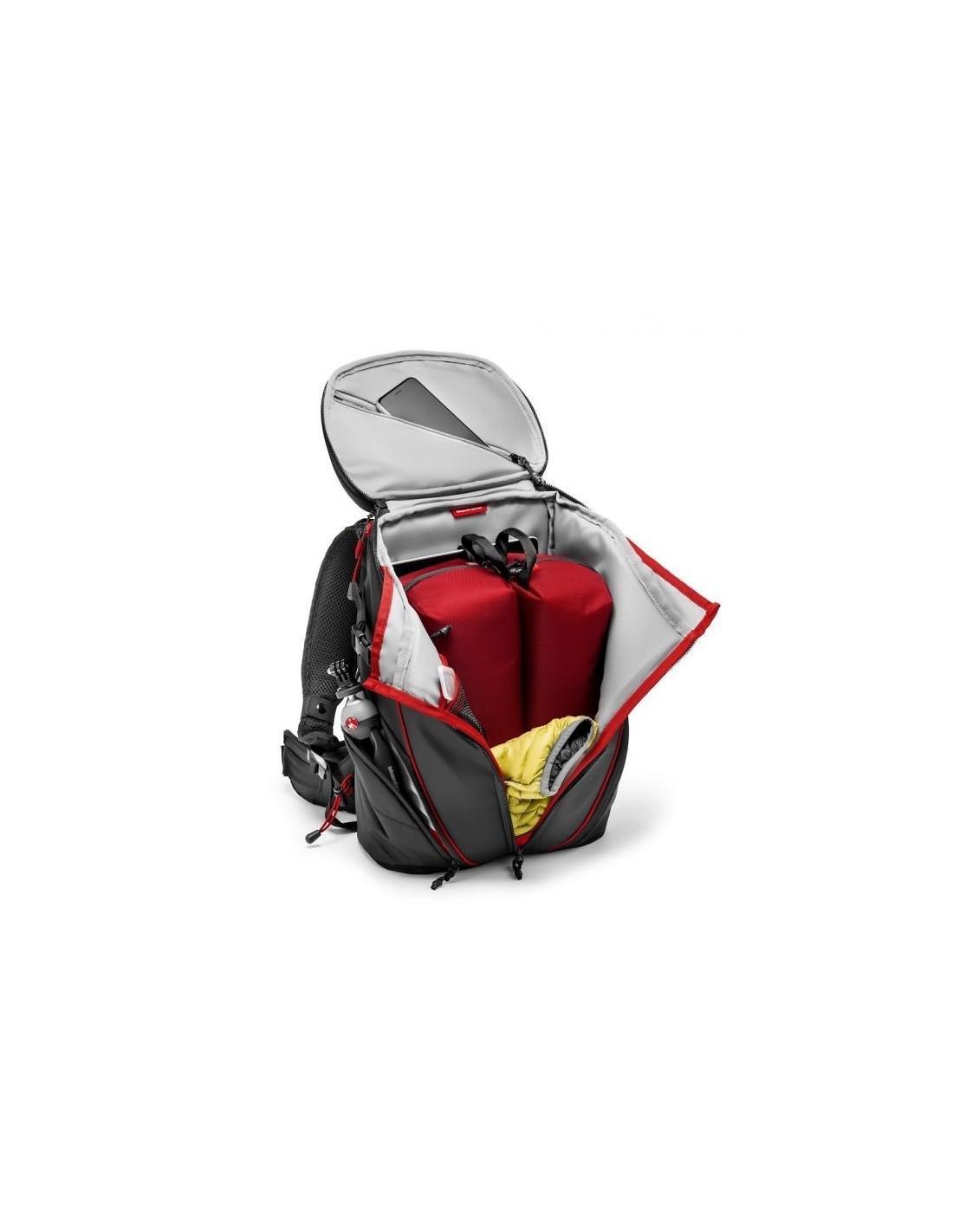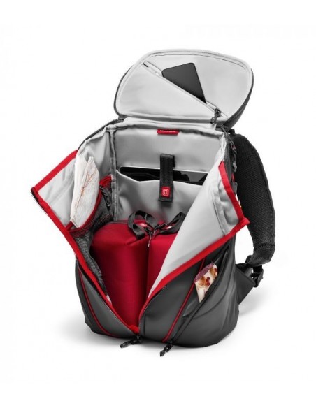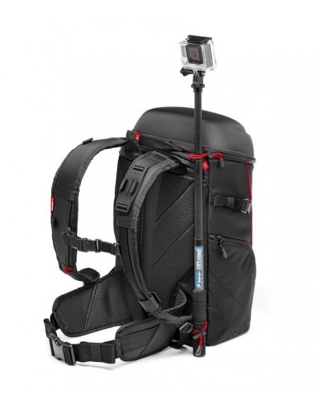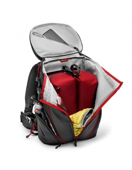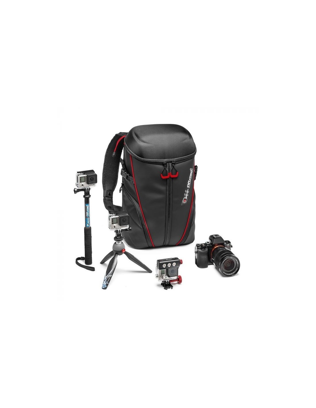 Gracias a sus estuches de protección internos extraíbles, puede transportar hasta 3 cámaras de acción, una cámara mirrorless/CSC (Compact System Camera) como una Sony A7+24-70/4, accesorios y equipo personal. La mochila Manfrotto Off road Stunt Backpack es compatible con GoPro® y otras cámaras de acción gracias a los divisores intercambiables del interior de los estuches. La bolsa ha sido diseñada con materiales premium de alta calidad y una cuidadosa atención a la ergonomía y el confort.