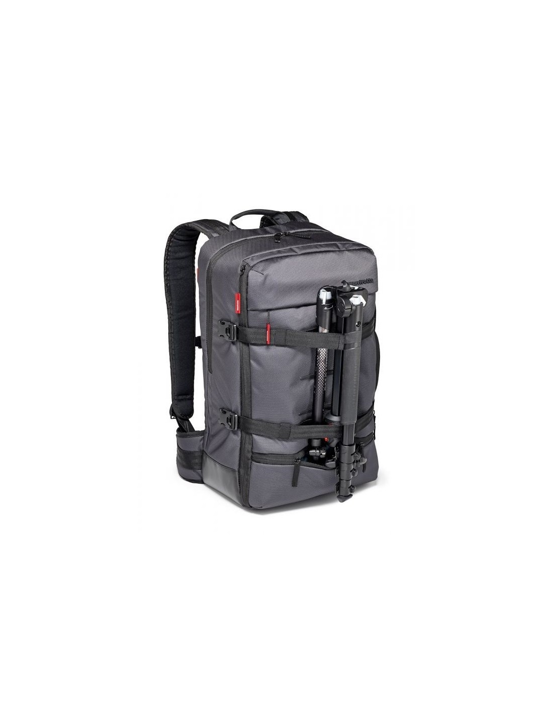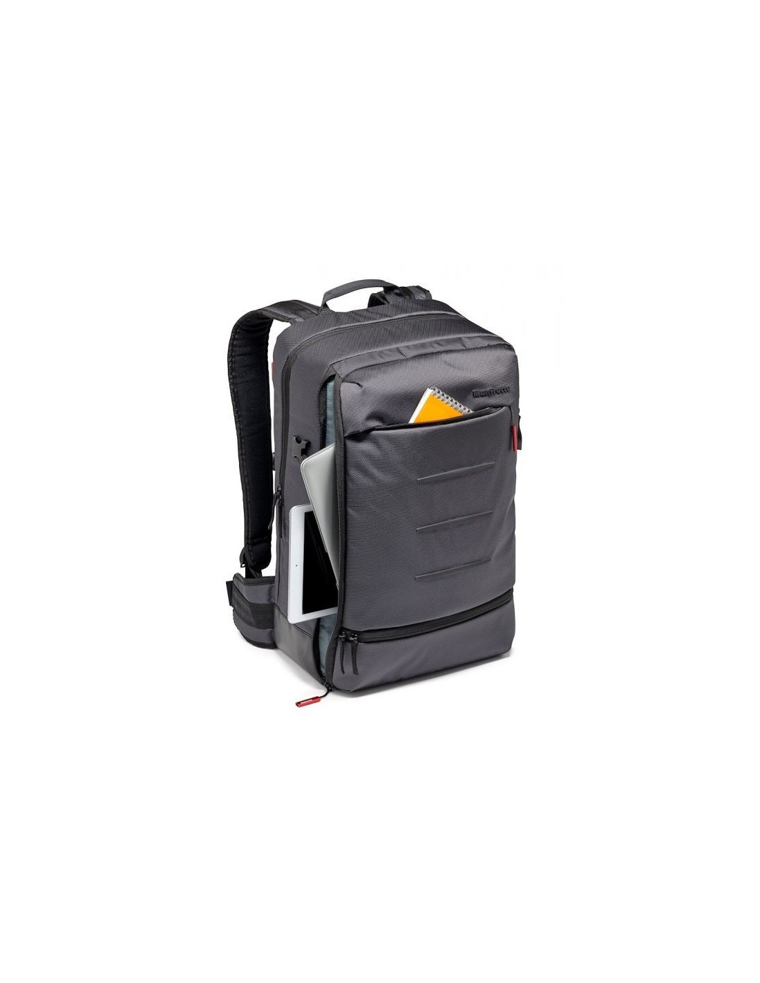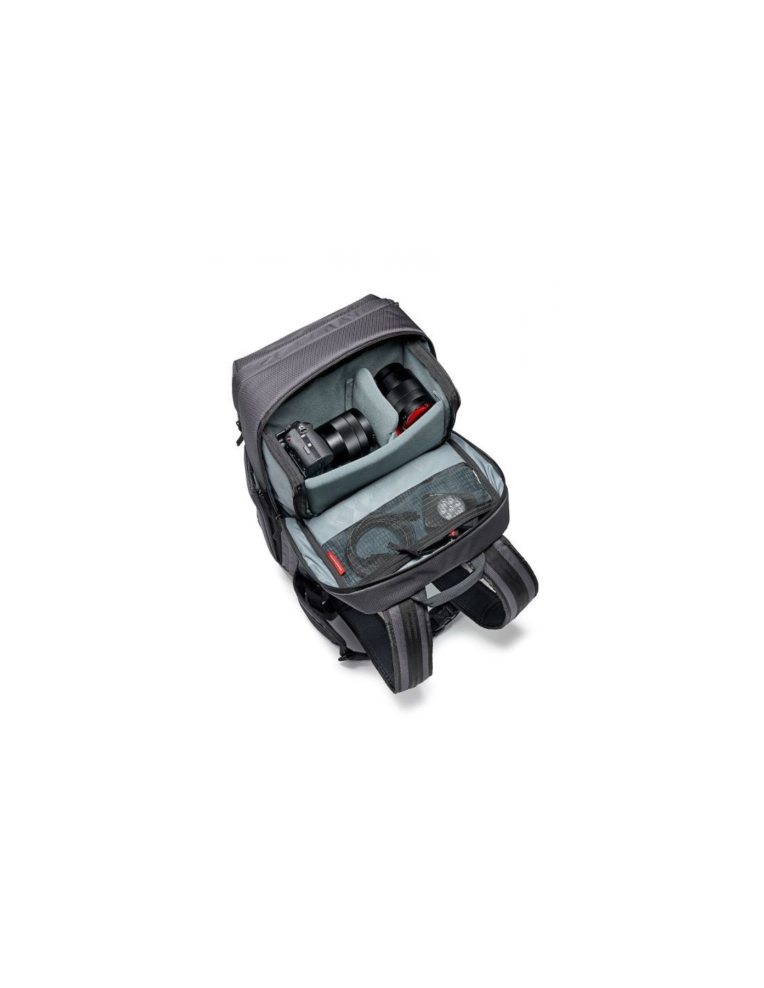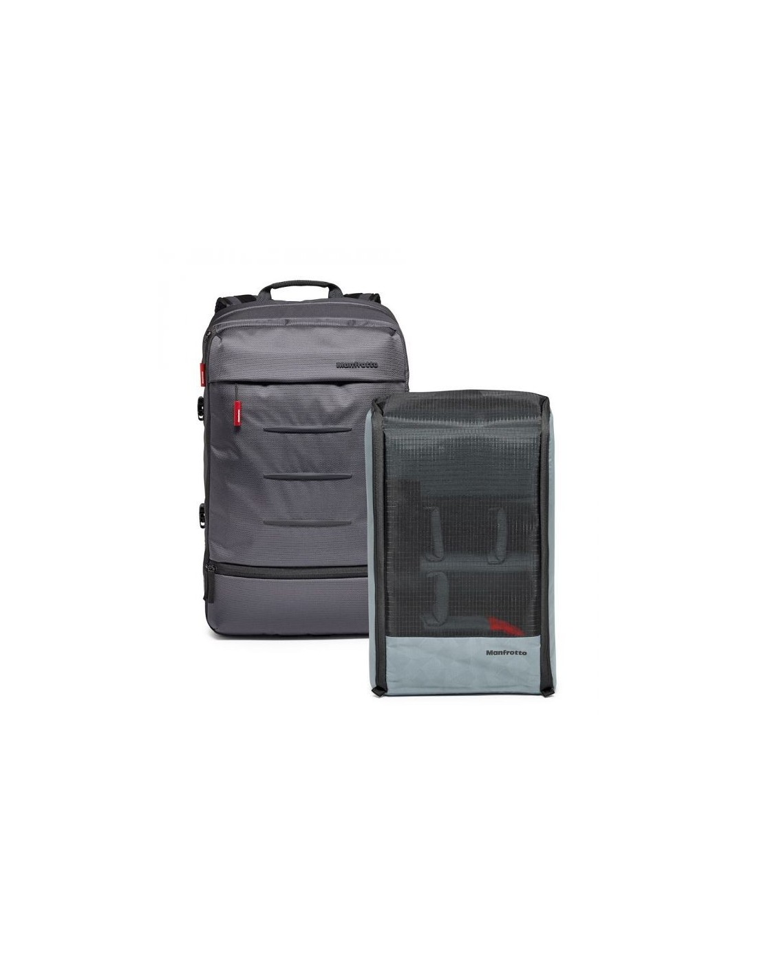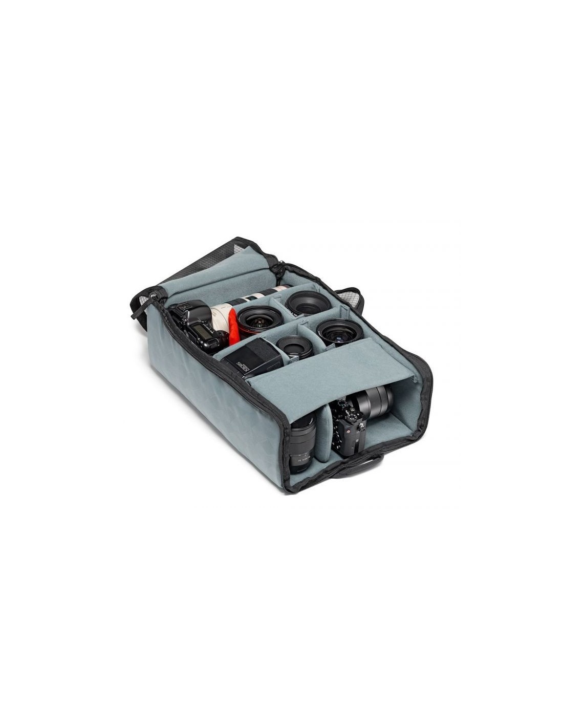 Su compartimento interior extraíble, marca de la casa, te ofrece dos bolsas en una. La funcionalidad extrema del estuche interno se caracteriza por el innovador sistema de protección Flexy Camera Shell, diseñado por Manfrotto. Es suficientemente grande para almacenar una cámara DSLR con un 70-200mm f.2.8 más 4 objetivos adicionales y un flash. En la parte superior hay espacio para tu cámara sin espejo (CSC) como la Sony A7 o la Fujifilm XT con un zoom estándar más un objetivo adicional. Puedes acceder a tu equipo a través del acceso trasero seguro o por la parte superior de acceso más fácil. En su parte frontal está el sistema de fijación de trípode NeverLose, que permite sujetar un trípode, un skate, objetos personales como una chaqueta e incluso un drone, si no se hace uso de este sistema, la mochila permite alamcenar las doble correa para mantener un look moderno y minimal. Dispone de dos compartimentos acolchados para guardar un portátil de 15,6'' y un iPad Pro de 9,7''. Si no necesitas llevar el equipo fotográfico contigo, puedes extraer el estuche interno y usar la mochila como bolsa de uso diario.