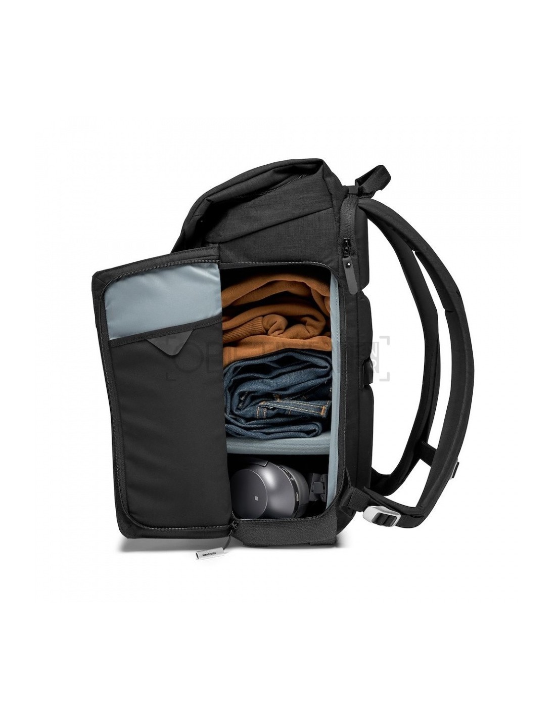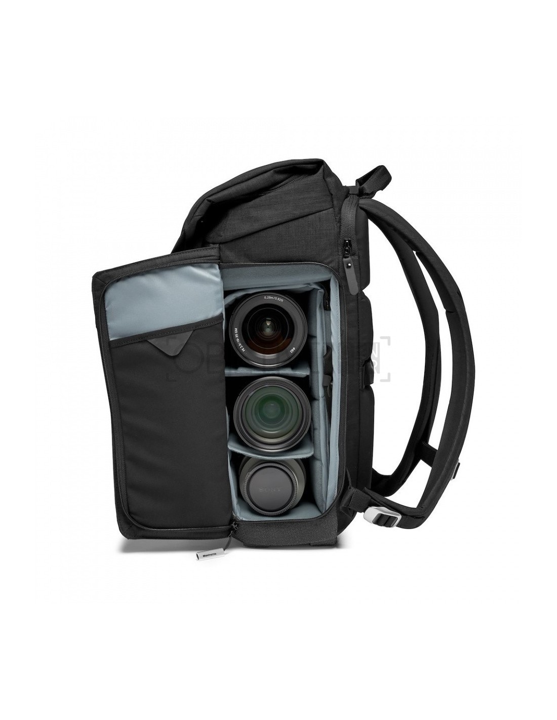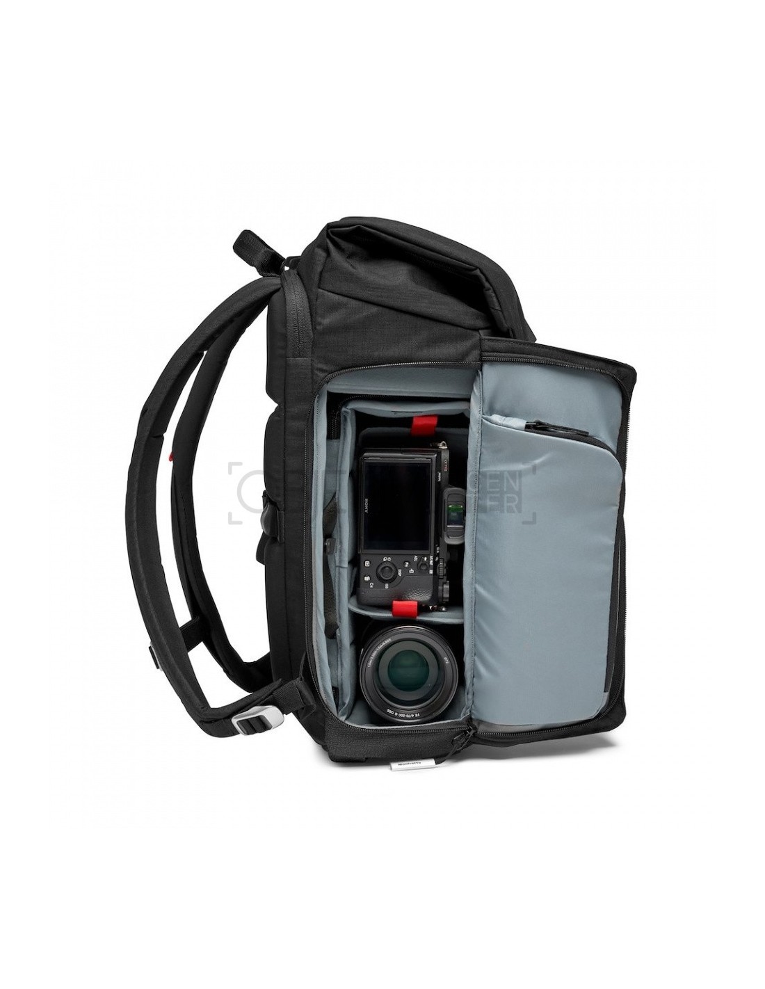 Las mochila fotográfica Manfrotto Chicago Small puede alojar una cámara mirrorless premium y 2-3 objetivos más, dependiendo del tamaño. Posee un compartimiento superior diseñado para transportar objetos personales. También pueden alojar un DJI OSMO Mobile en su bolsillo específico para gimbal en una de las tapas laterales. Su compartimiento para ordenador portátil separado, situado en la parte trasera del compartimiento principal, puede almacenar un portátil de 14’’.