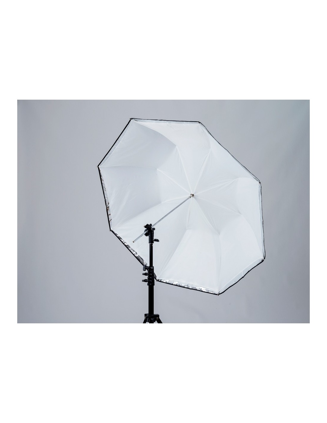 –Paraguas 2 en 1 en tamaños de 80cm y 100 cm. Estos modelos como su nombre indica pueden usarse de dos maneras. La tela principal con la que está construido, es traslúcida y de esta manera actúan como un paraguas normal de tela blanca por la que pasa y suaviza la luz. Lo que es diferente es que incluyen una funda de tela con el interior plateado, que se coloca a modo de capa, sobre la tela blanca y hace que estas sombrillas se puedan utilizar como si fueran reflectores con un fondo blanco.