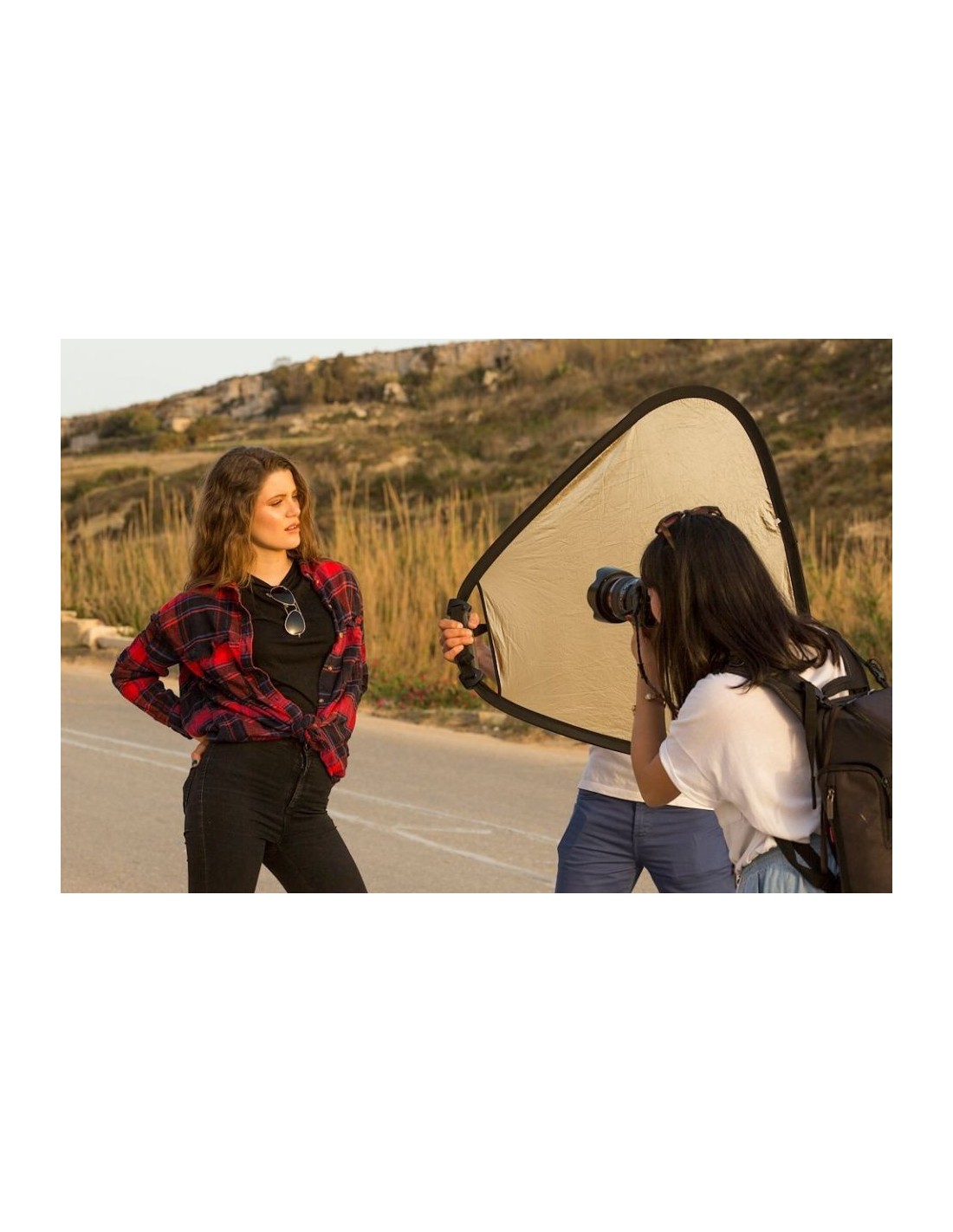 El Reflector Trigrip de 75 cm Blanco/ Plata de Manfrotto, es un reflector de doble cara con un acabado dorado o plateado según convenga que tiñe la luz ambiente, modificando la temperatura de color según convenga en cada situación.