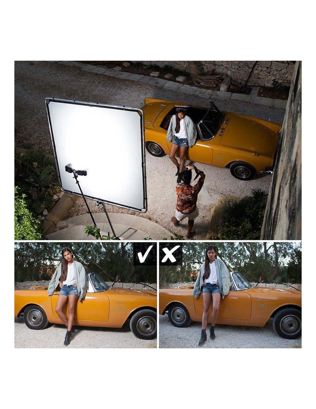 Ambas caras del reflector Skylite Rapid sirven como fondo fotográfico liso.