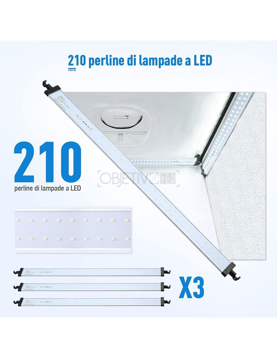 La caja de luz fotográfica OMBAR de 80X80X80 cm contiene todos los elementos que necesitas para tomar fotografías! La caja de luz está equipada con 3 potentes tableros de luz (cada tablero LED: 70 cuentas LED SMD de 0,5 W; temperatura de color: 5600 K. El brillo extremadamente alto (8000 lm+) y la alta reproducción cromática (95+) proporcionan un efecto de disparo natural y vívido.