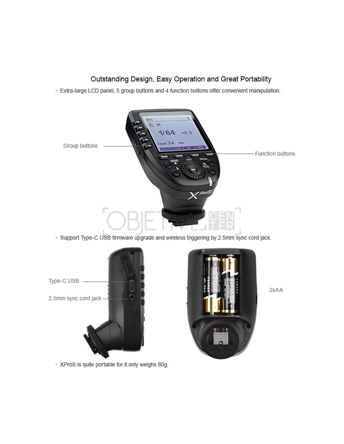 - Godox Diseño excepcional XPro-S, fácil operación y alta portabilidad. La pantalla LCD extragrande, 5 botones de grupo y 4 botones de función proporcionan un manejo cómodo. XproS es muy portátil como pesa solo 80 g