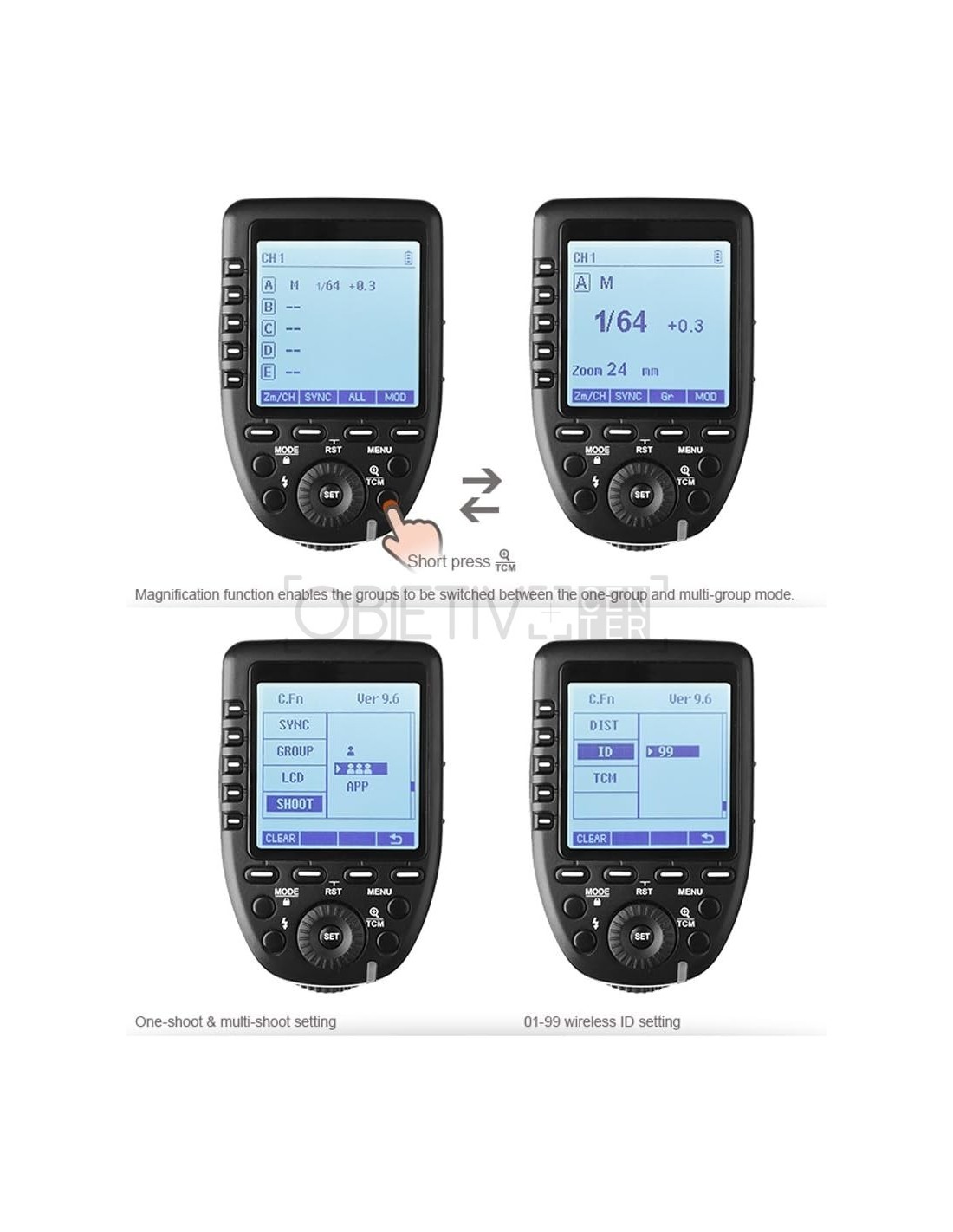 - 16 grupos y 32 canales para control inalámbrico y disparo. Agregar 01 a 99 configuraciones de identificación inalámbrica que solo se puede activar cuando los canales y los identificadores inalámbricos de la unidad principal y la unidad esclava se establecen en la misma manera, evitando eficazmente la interferencia de la señal