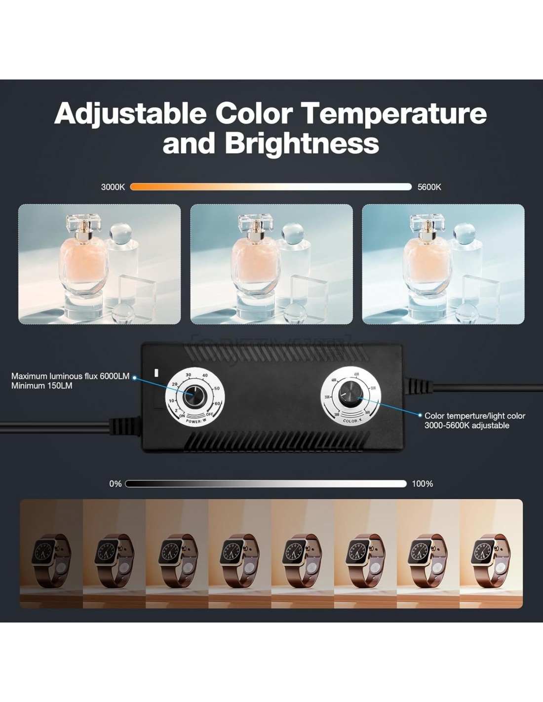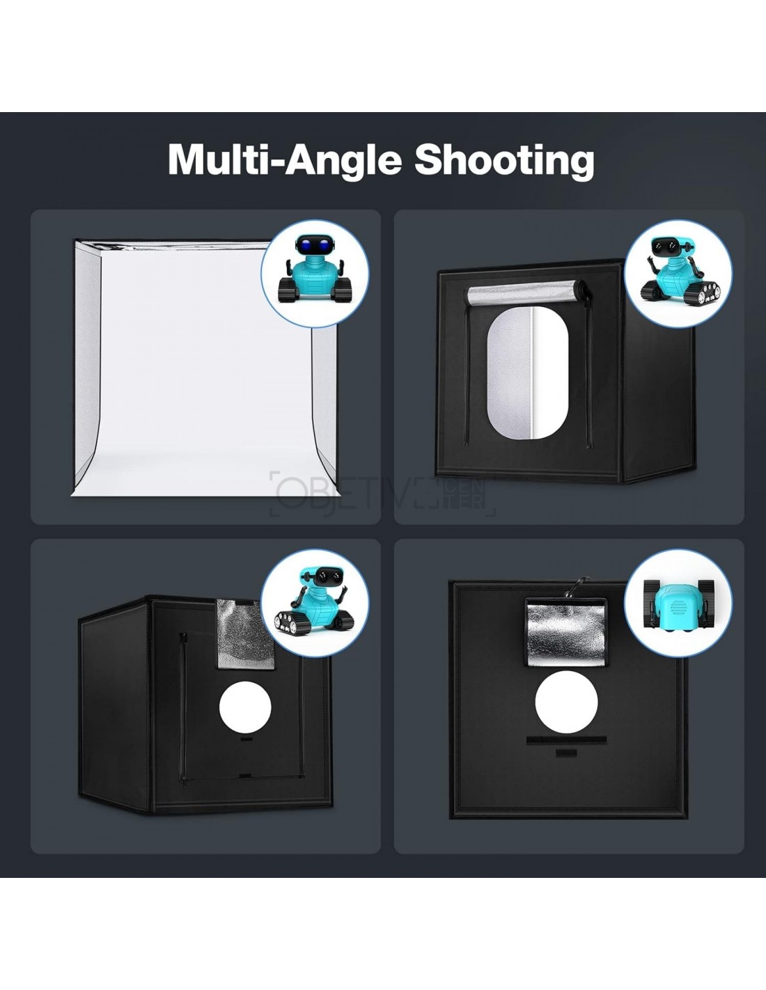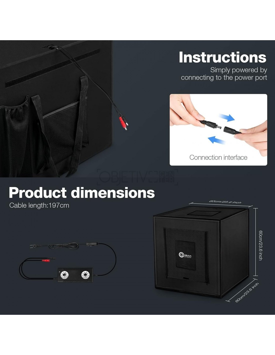 Luz LED de brillo ajustable: La caja para fotografía con brillo ajustable OMBAR de 60X60X60 cm contiene todos los elementos que necesita para tomar fotografías! La caja de luz está equipada con 4 potentes tableros de luz (cada tablero LED: cuentas de lámpara LED de 60 x 0,5 W; temperatura de color: (3000-5600 K). El brillo ajustable (150 lm-6000 lm) y la alta reproducción cromática (95+) proporcionan natural y vívido. El efecto de disparar.