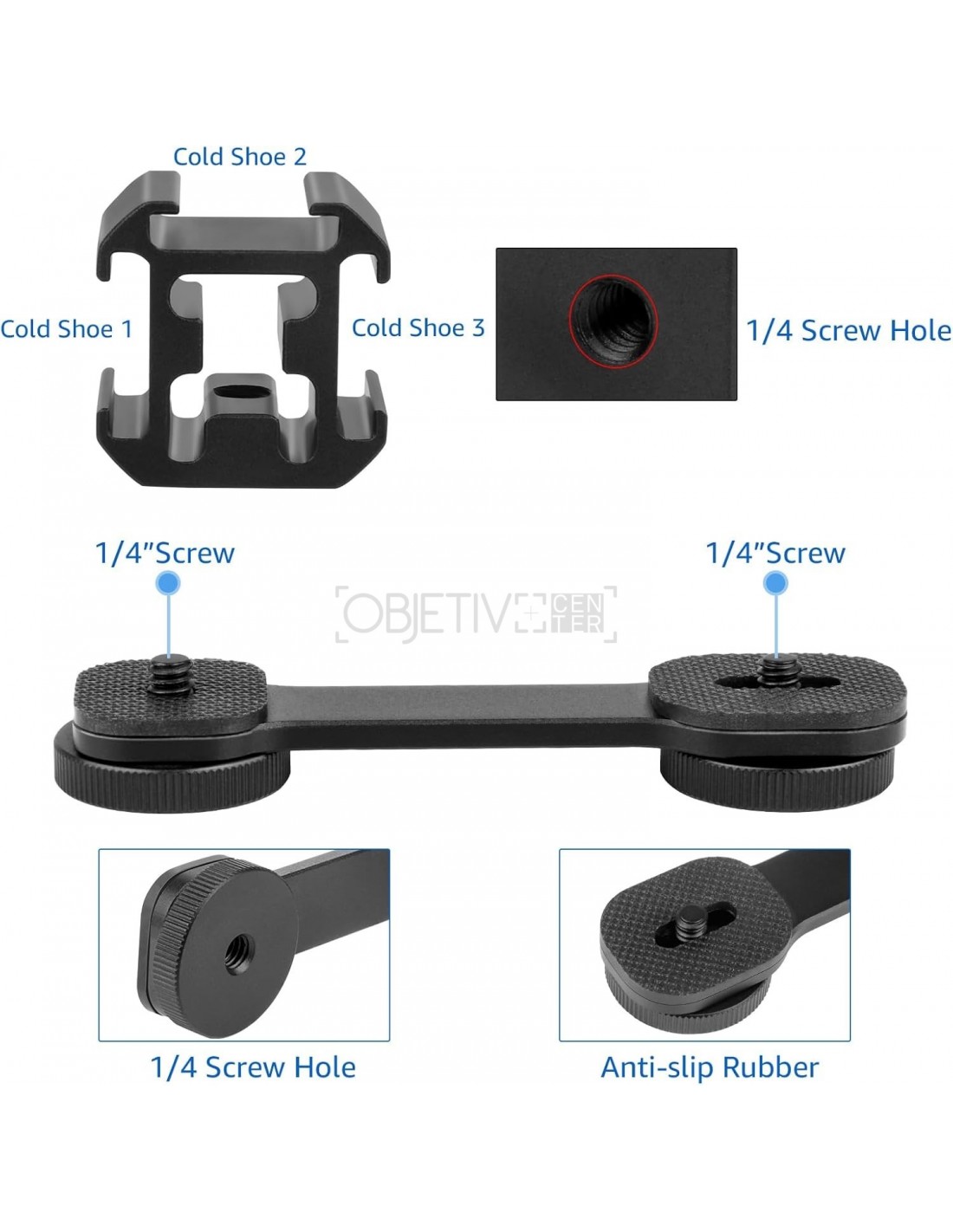 - Diseño multifuncional: este soporte de botas frías está hecho de aleación de aluminio duradera y tiene tres interfaces de botas frías y tornillos de 1 / 4 pulgadas y agujeros roscados. Le ofrece una variedad de opciones de conexión para conectar fácilmente micrófonos, pequeñas luces de vídeo led, monitores y otros dispositivos, ofreciendo más posibilidades para su creación fotográfica y de Cámara.