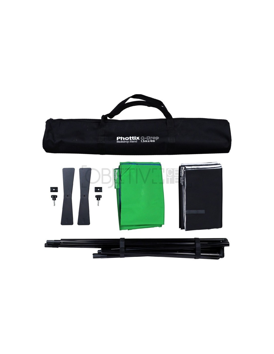 El Soporte para Fondos Portatil Q-drop Kit Marco con Fondos de Phottix es un sistema compuesto por un marco rectangular plegable y dos telones reversibles de fondo plegable de 1,52 m (5”) de ancho x 2,26 m (7,4”) de alto.