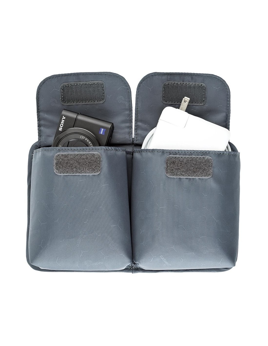 Panel organizador de 2 caras con correas elásticas y bolsillos acolchados.