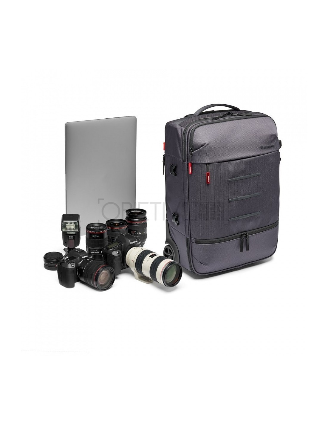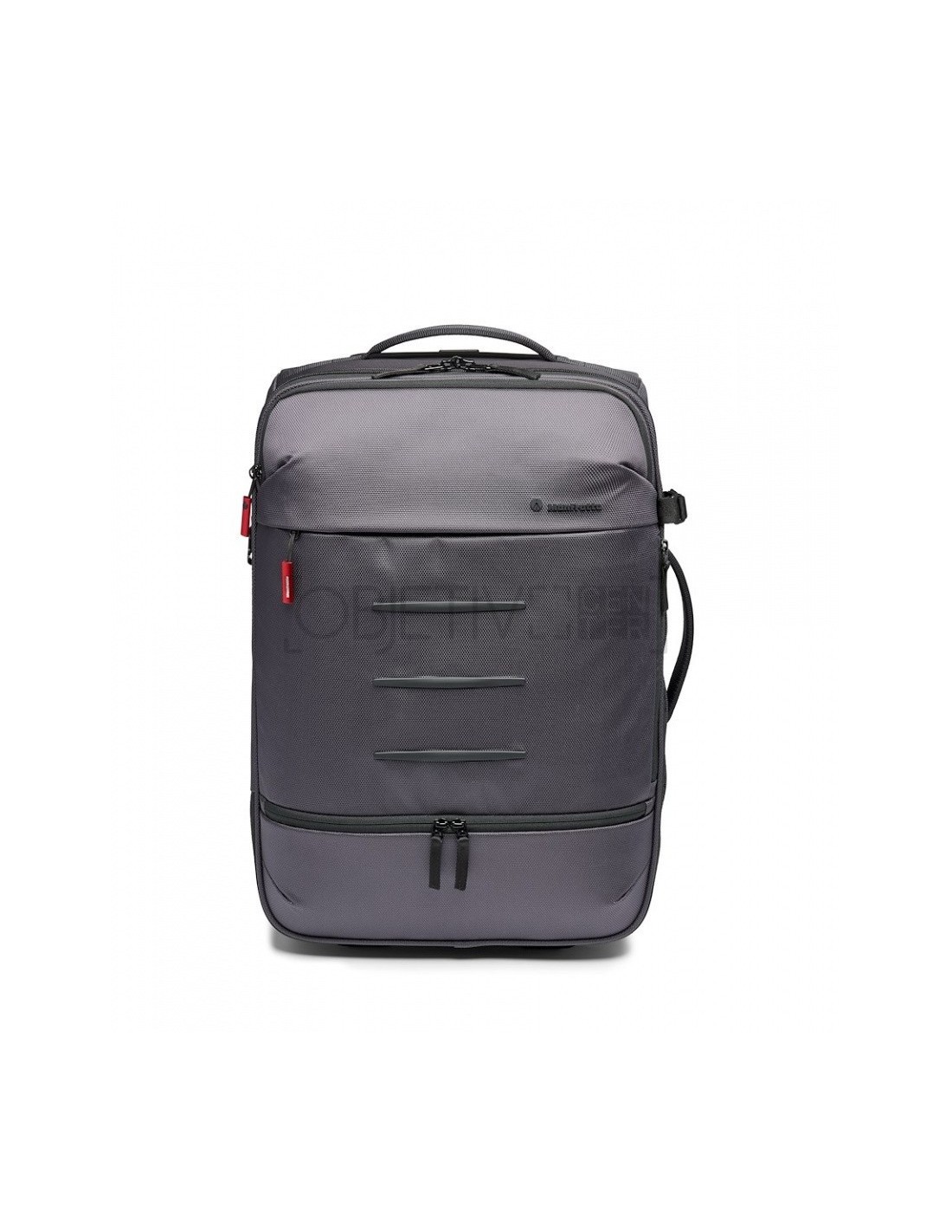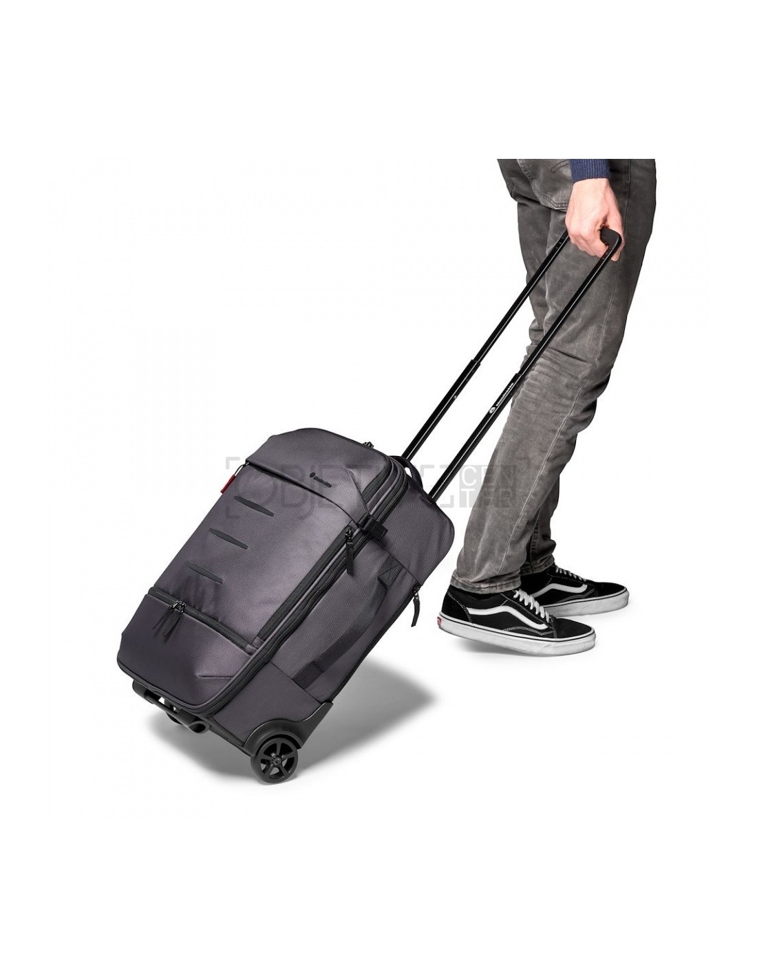 El Trolley fotográfico Manhattan Runner-50 para DSLR/CSC fabricado por Manfrotto, es una mochila convertible a maleta trolley, equipada con asas superior y lateral para un mejor manejo de la misma.