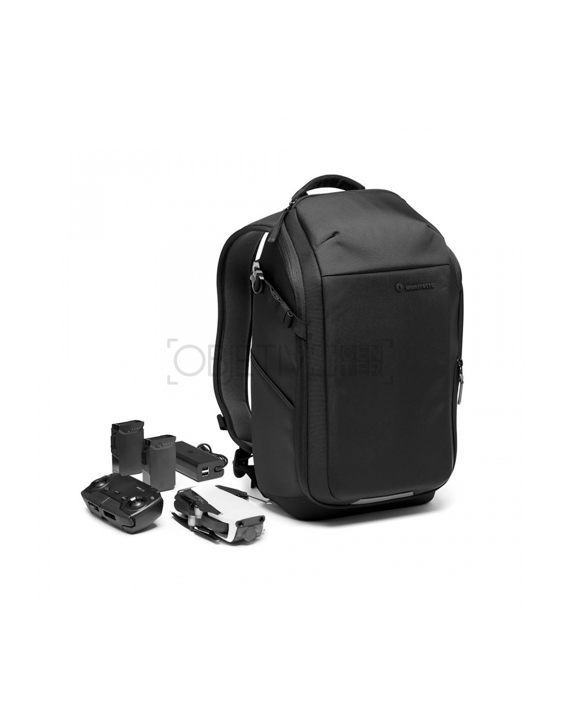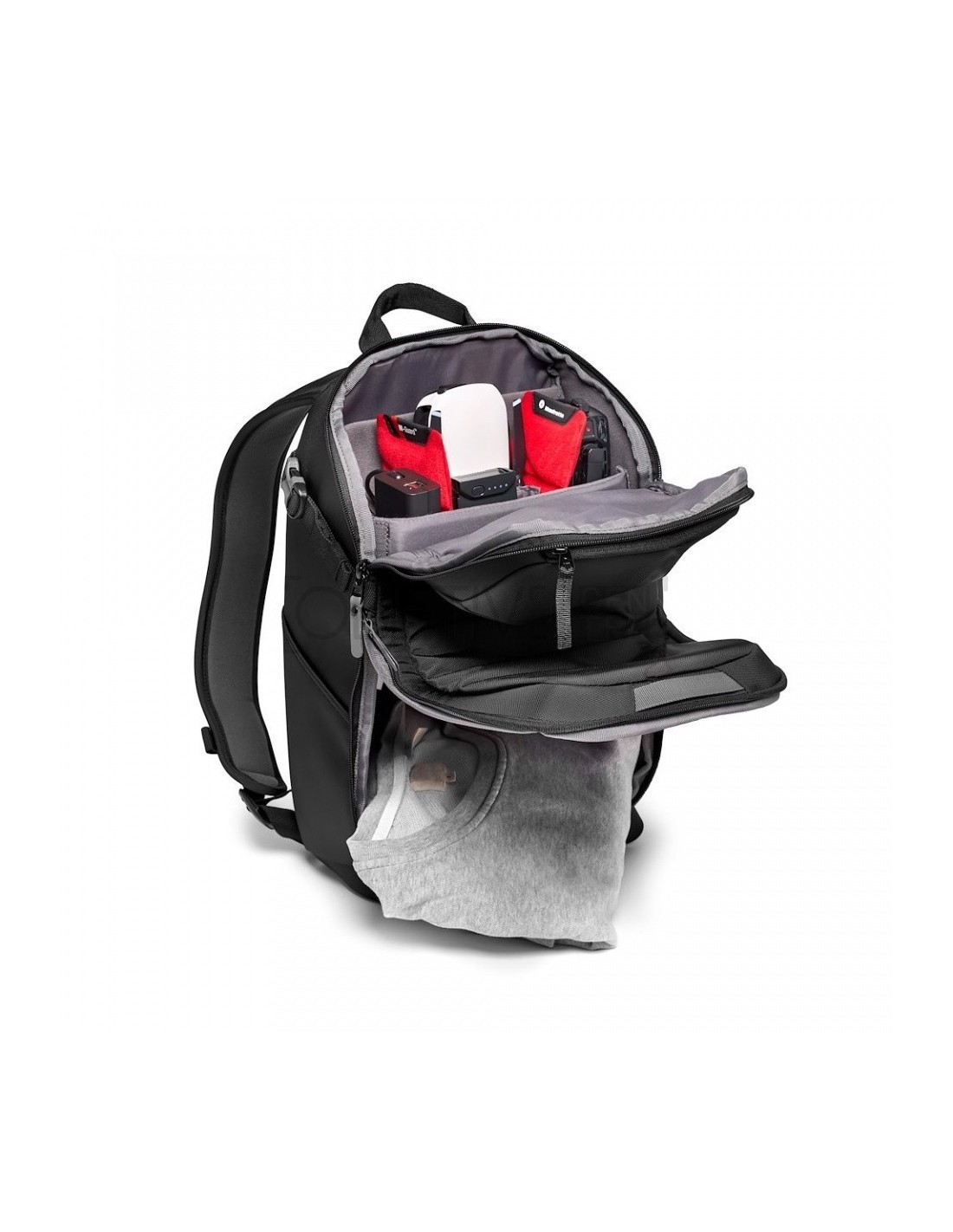 El compartimento superior acolchado está diseñado para cámaras CSC (como la serie Sony A6000), y en él caben de 2 a 3 objetivos adicionales dependiendo del tamaño. Los divisores del compartimento principal permiten mantener tu equipo perfectamente organizado.