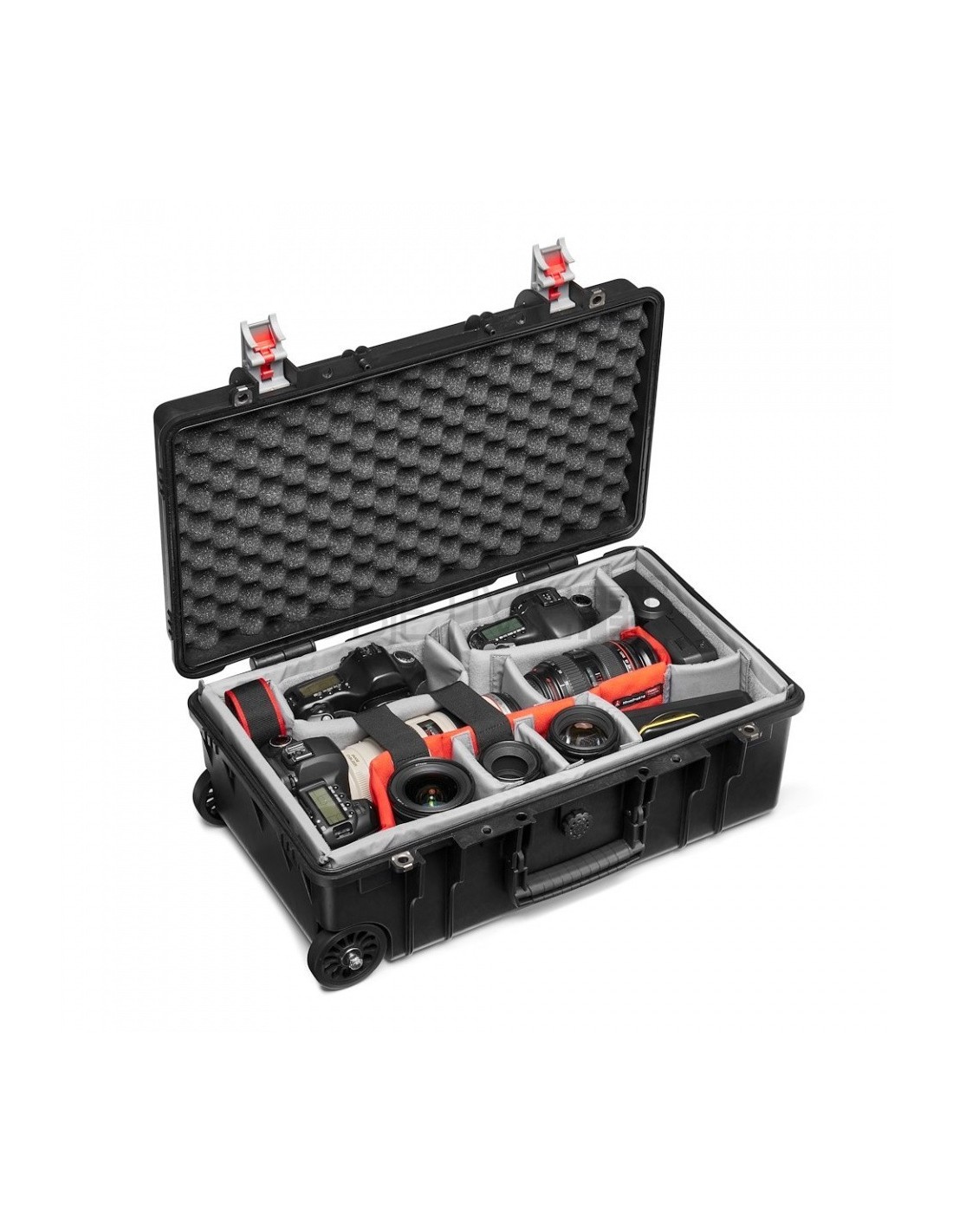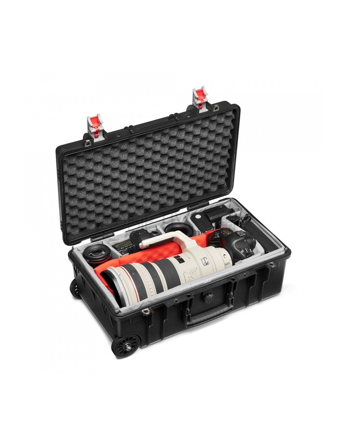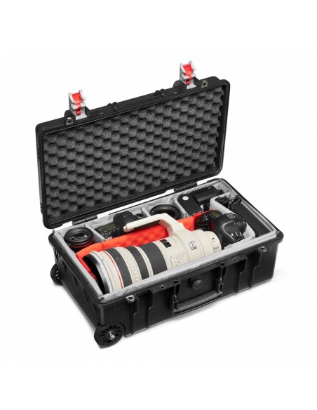 Esta maleta está hecha en Italia con materiales de alta resistencia, basados en el estándar ligero y militar, con un estilo original de Manfrotto. Fabricado y diseñado para viajeros que no desean comprometerse entre la seguridad y la portabilidad, esta maleta se adapta a los tamaños de equipaje de mano internacionales * y cuenta con un sistema de carro retráctil de 2 etapas. El nuevo Pro Light Reloader Tough H-55 tiene una unidad de organización de cámara extraíble interna que se puede personalizar utilizando los separadores ajustables CPS de Manfrotto. El estuche puede adaptarse a una DSLR profesional con una lente 400/ f2.8, un segundo cuerpo de cámara y 3-4 lentes adicionales según el tamaño.