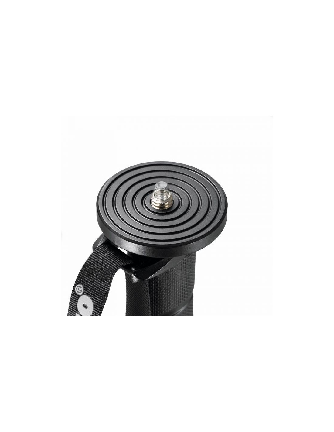 La construcción en 4 secciones permite al monopié ser extremadamente compacto para un fácil transporte cuando está plegado. Una correa de muñeca mantiene el monopié y la cámara firmemente seguros y el nuevo calentador en goma mejora el agarre.