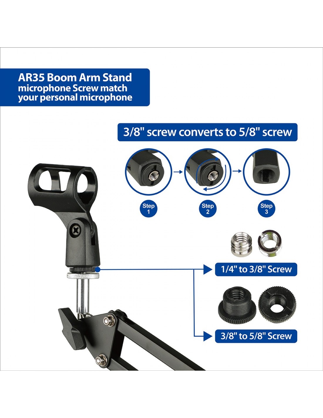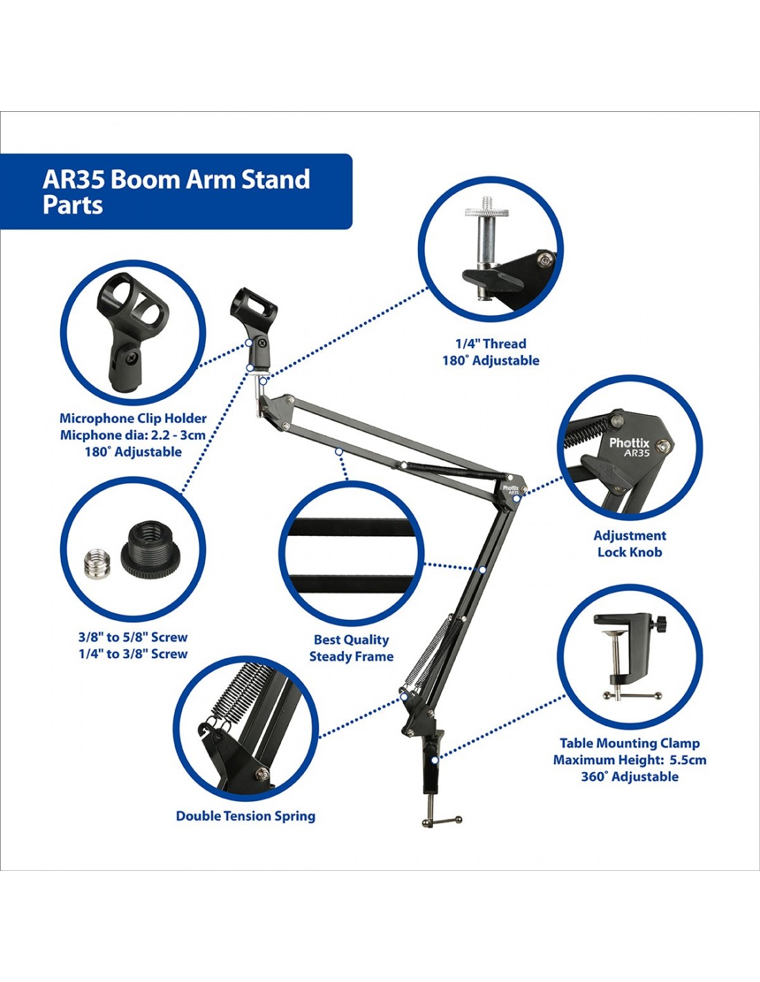 El soporte de brazo articulado Phottix AR35 está diseñado para el micrófono de montaje, la luz LED y la cámara web que se adapta con un montaje de tornillo de 1/4 ”a un escritorio, lo que permite ajustar fácilmente la altura y los ángulos