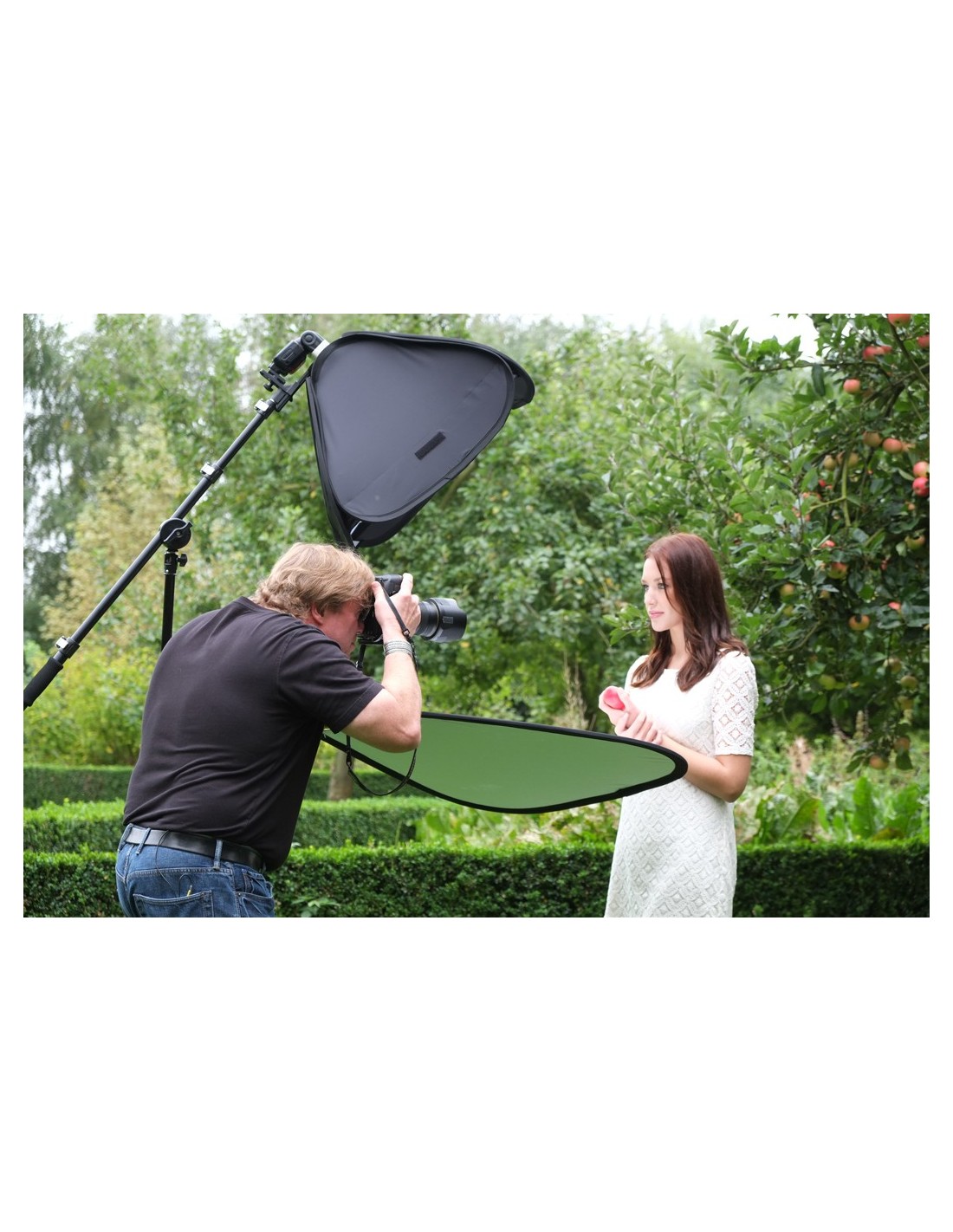 El Ezybox Hotshoe de 54 x 54cm (21" x 21") convierte la luz direccional dura de un flash de zapata con cabezal inclinable en una luz suave, y se monta en un soporte de iluminación o en un soporte de cámara.