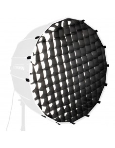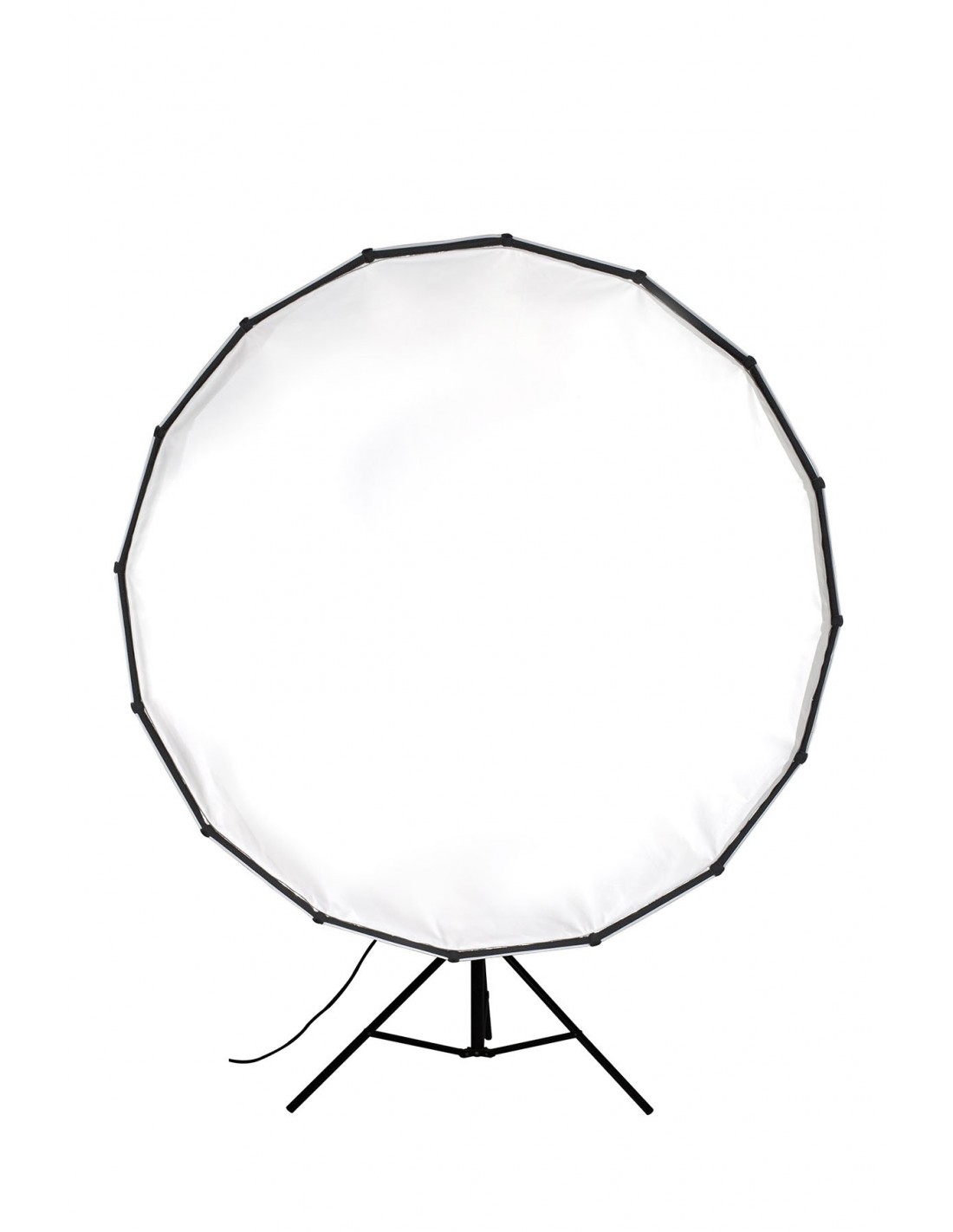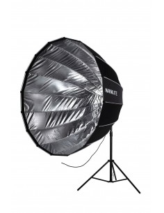 Con 150 cm de diámetro, su estructura está soportada por 16 varillas de acero. Su superficie interior reflectante en plata potencia la salida de luz, y sus dos difusores interno y externo son extraíbles. Este softbox parabólico genera una luz suave con bordes definidos, con apariencia de luz natural, idóneo para sesiones de retrato y moda.